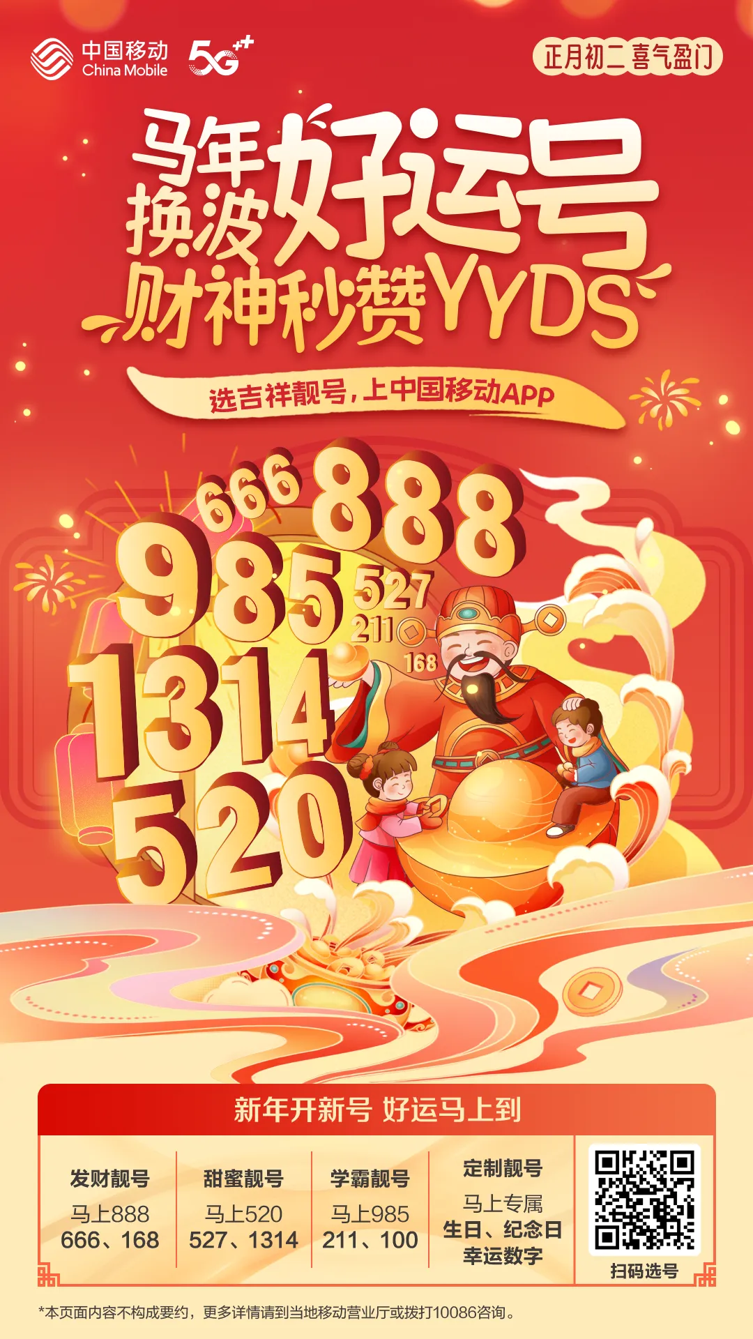 马年换好运号,上中国移动APP,发财靓号/甜蜜靓号/学霸靓号/定制靓号任你选!