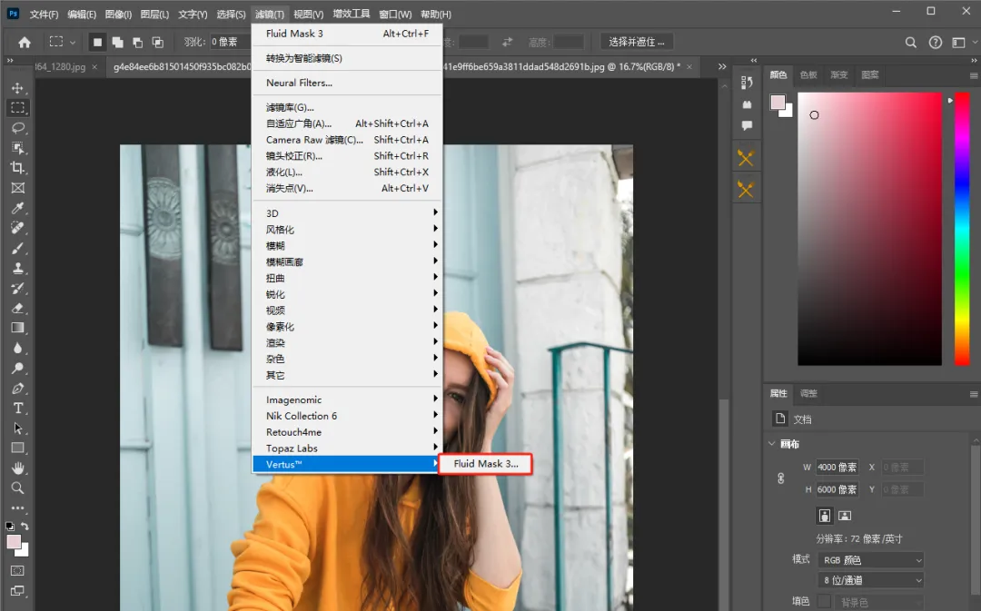 首先在 PS 中打开一张需要抠图的照片,菜单栏滤镜-Vertus-Fluid Mask 即可打开独立软件窗口操作界面。