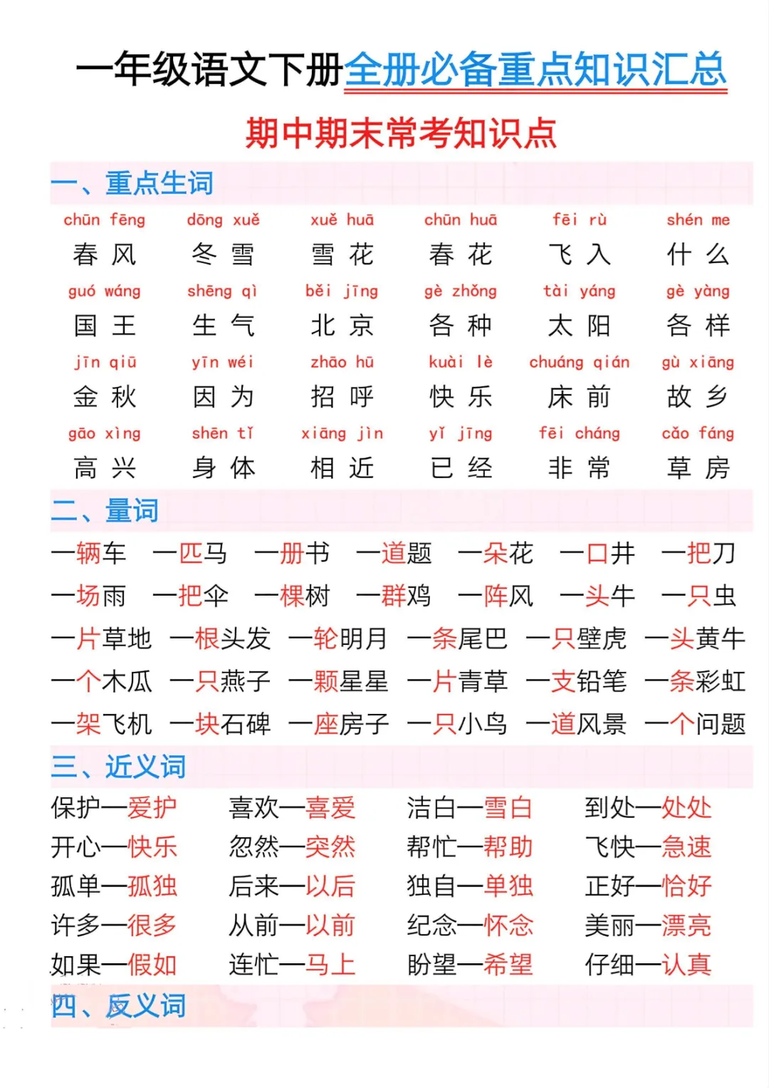 【免费下载】一年级下语文全册必背常考知识点,PDF电子版,可打印,共10页