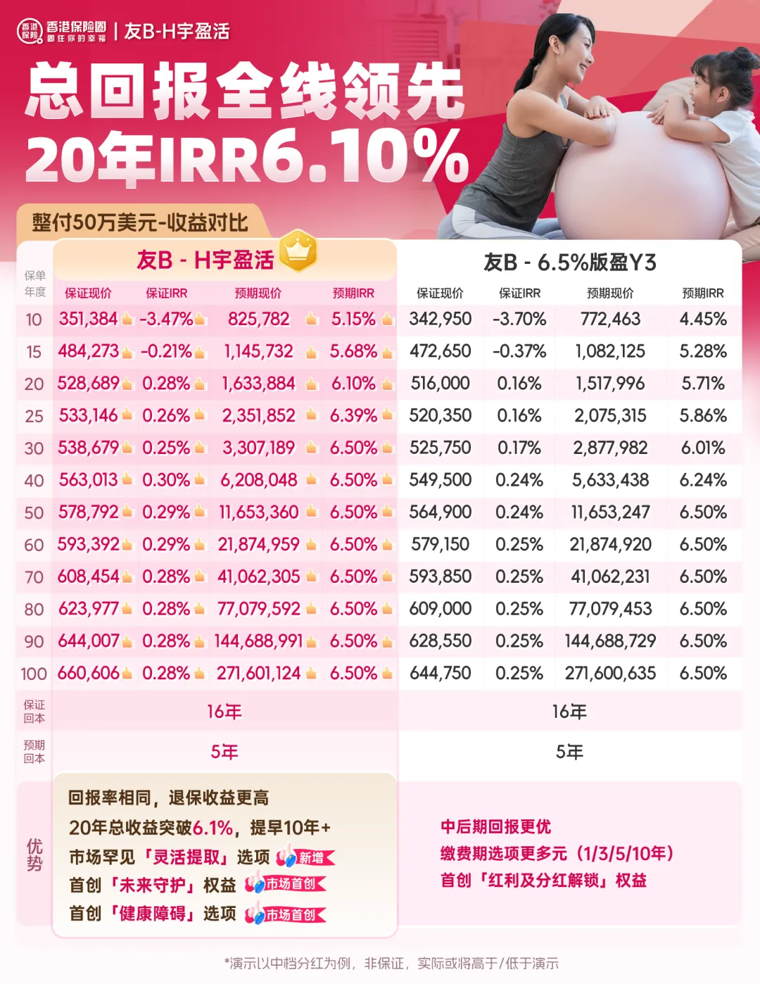 友邦最热门的「环宇盈活」为例,前 25 年收益位列前三,25 年IRR 达6.34%、30 年达 6.5% (市场最快登顶之一)。