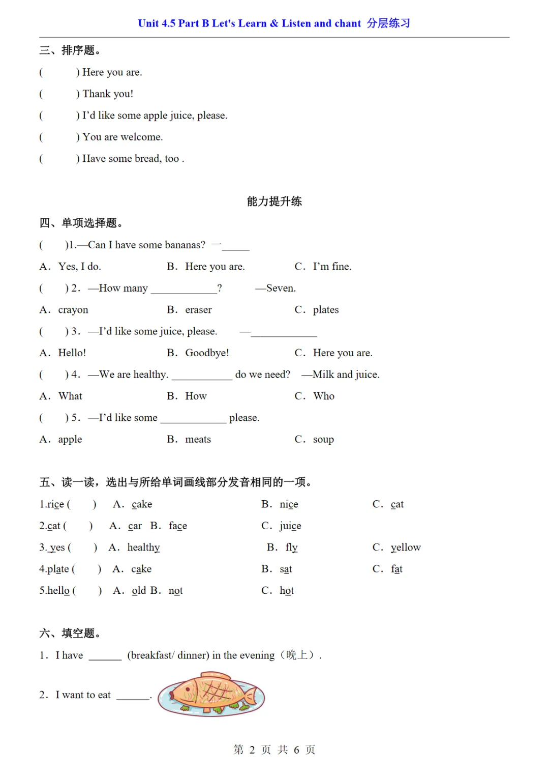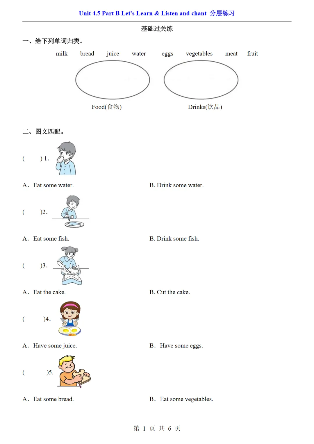 【免费下载】三年级(下)英语 Unit4.5 PartB分层练习《人教版PEP》,PDF电子版,共6页,可打印