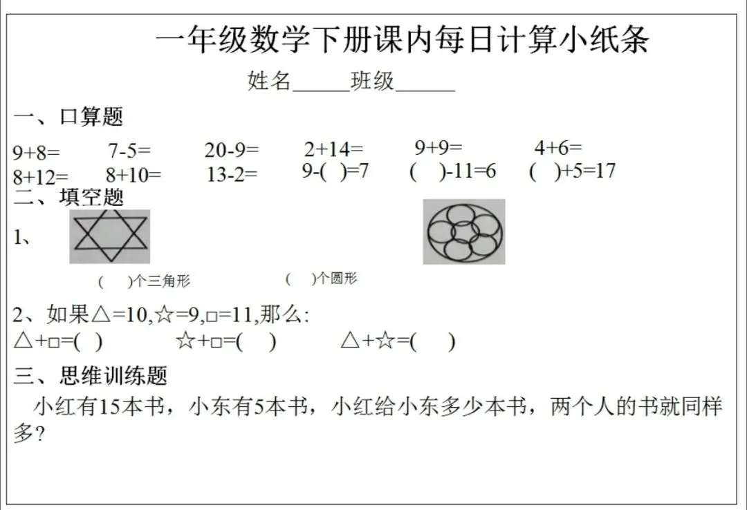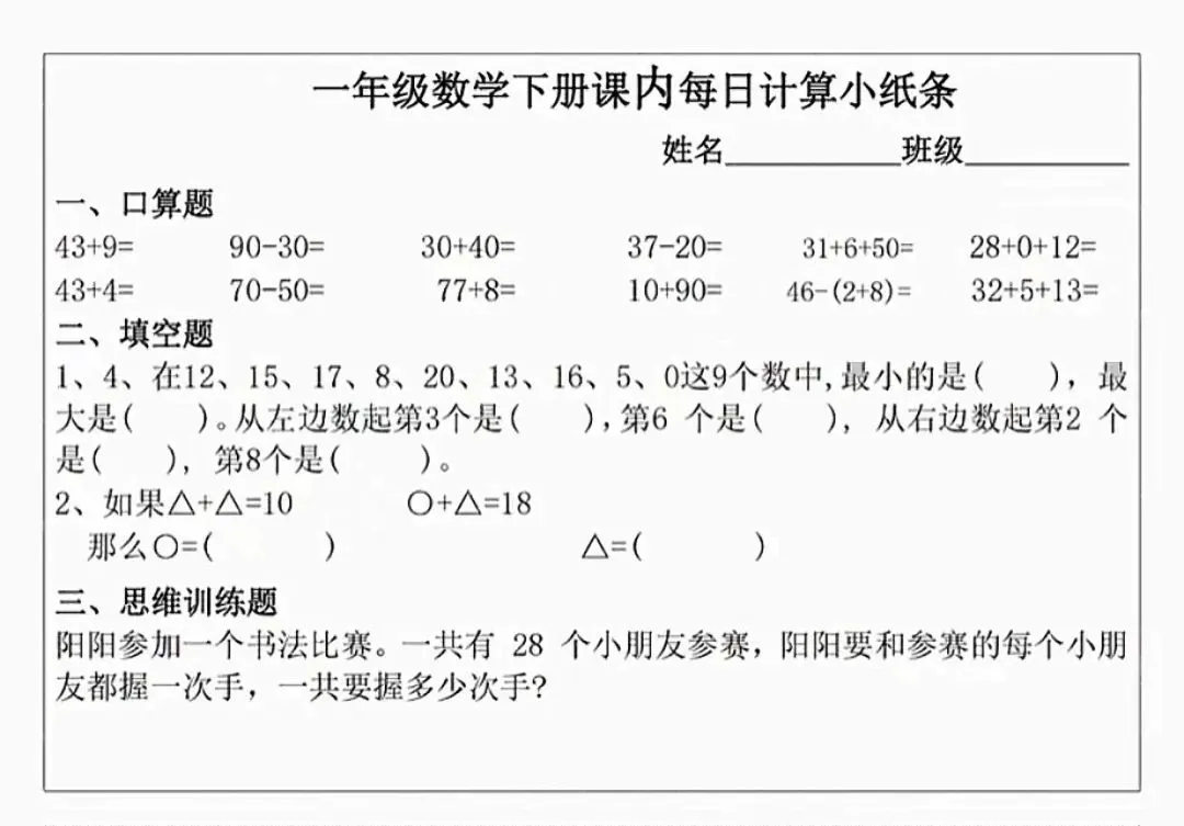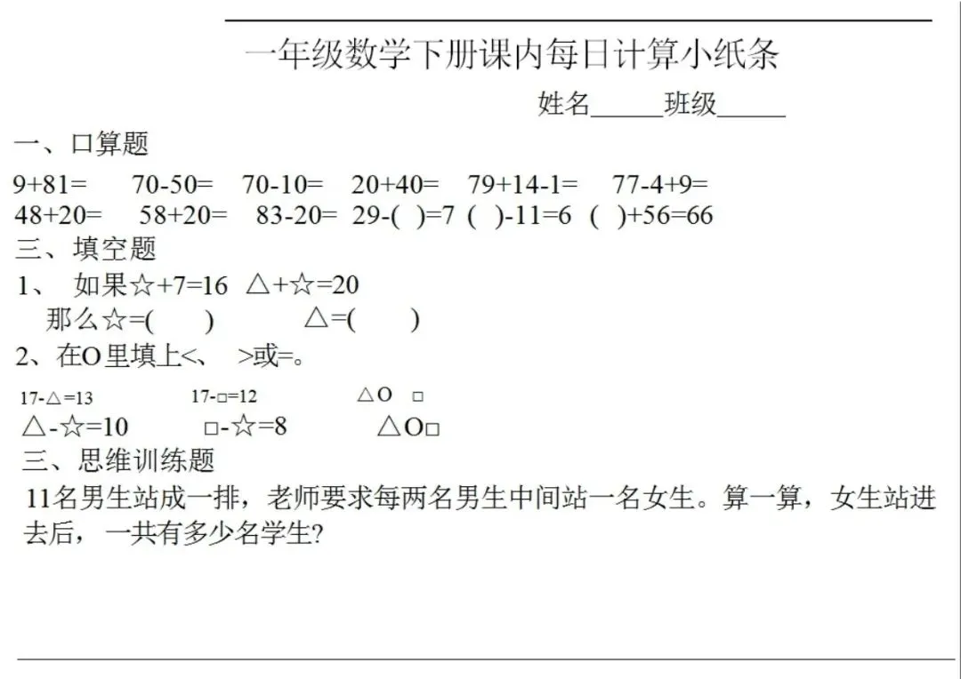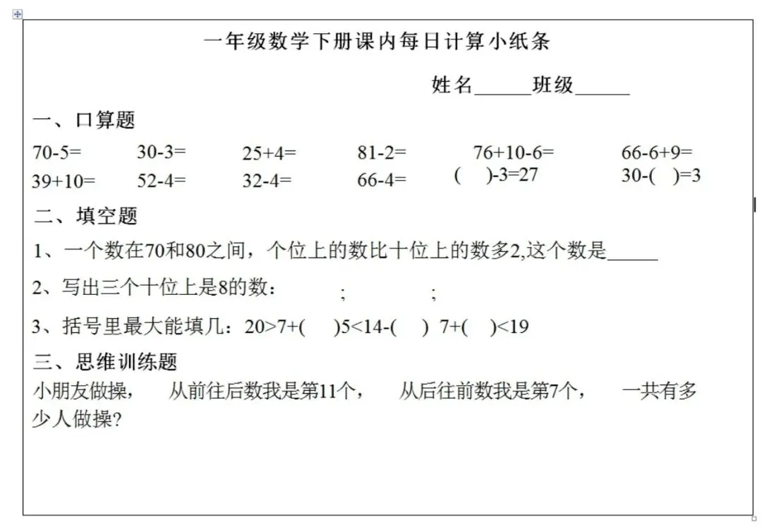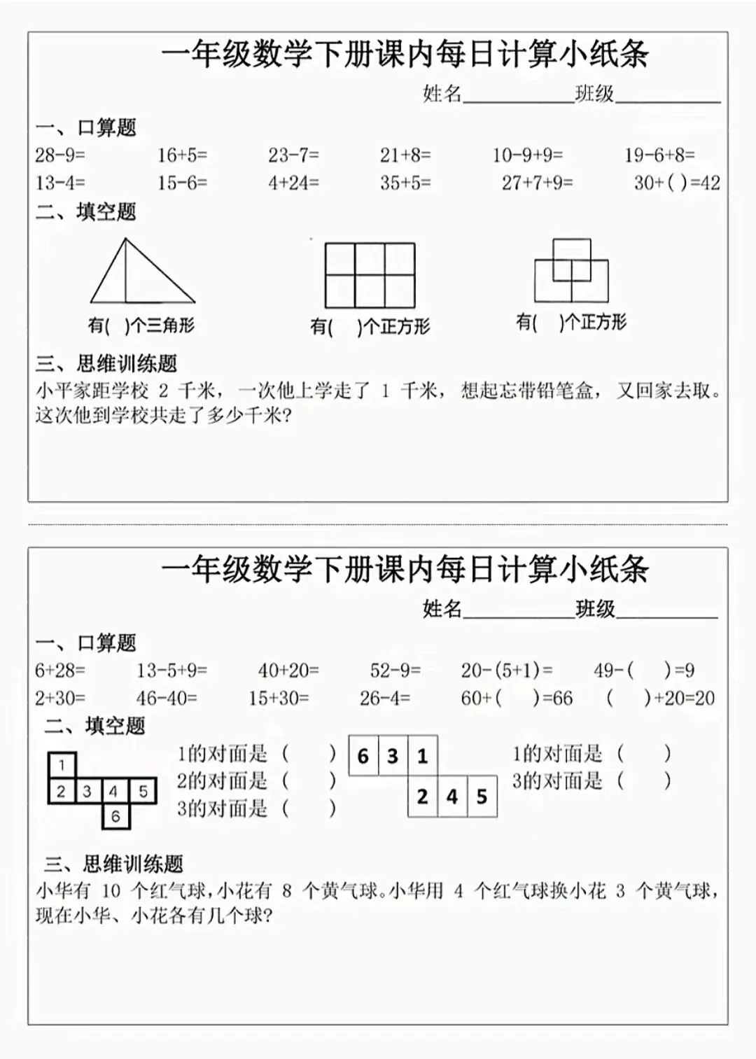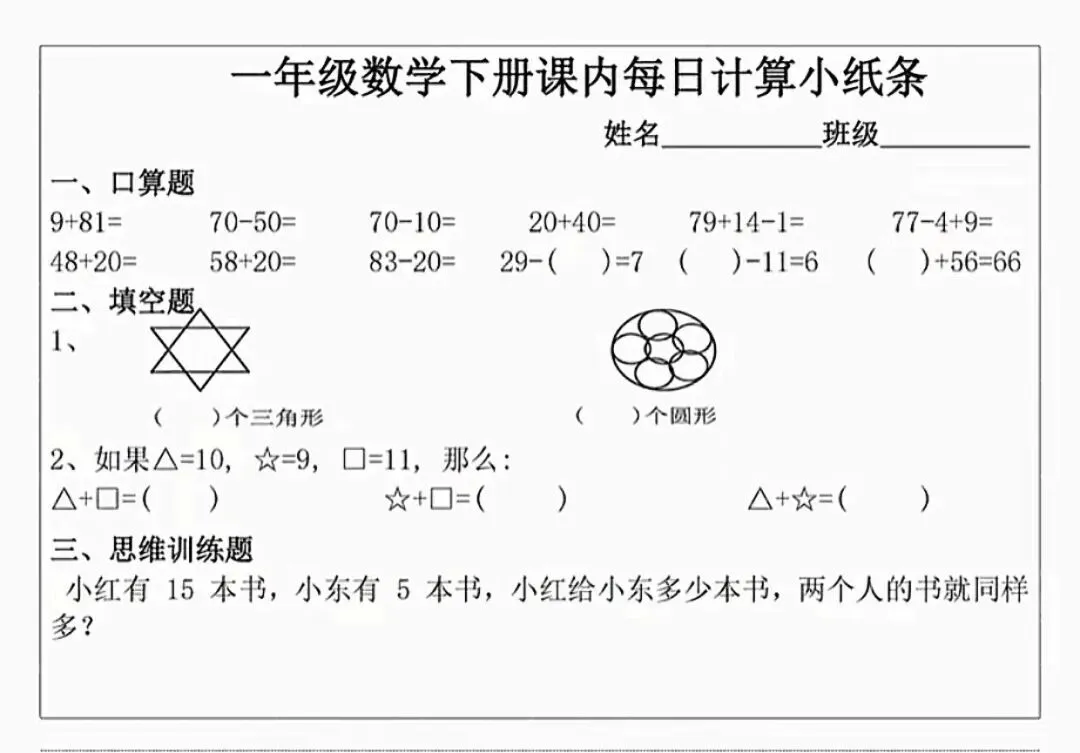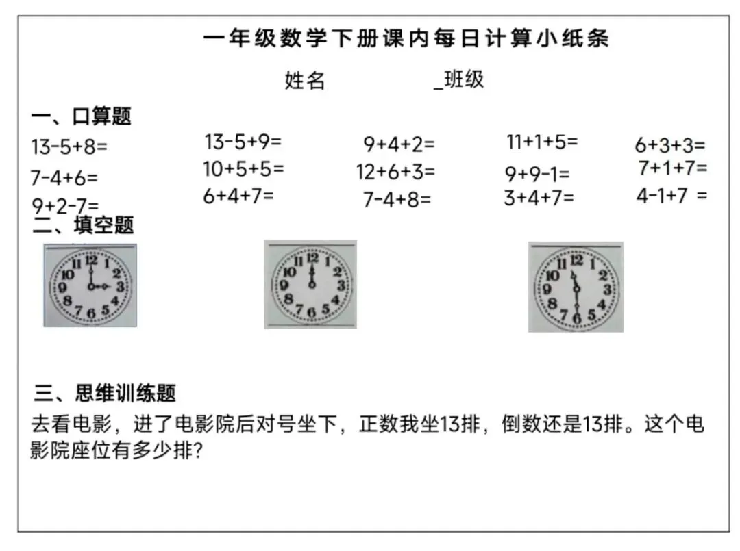 数学一年级下册《每日计算小纸条》(可下载打印)