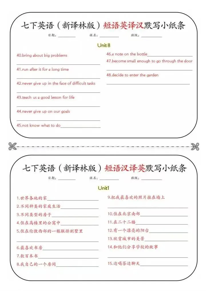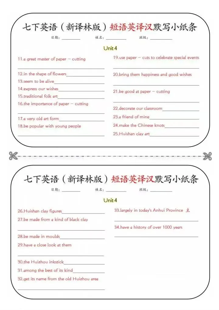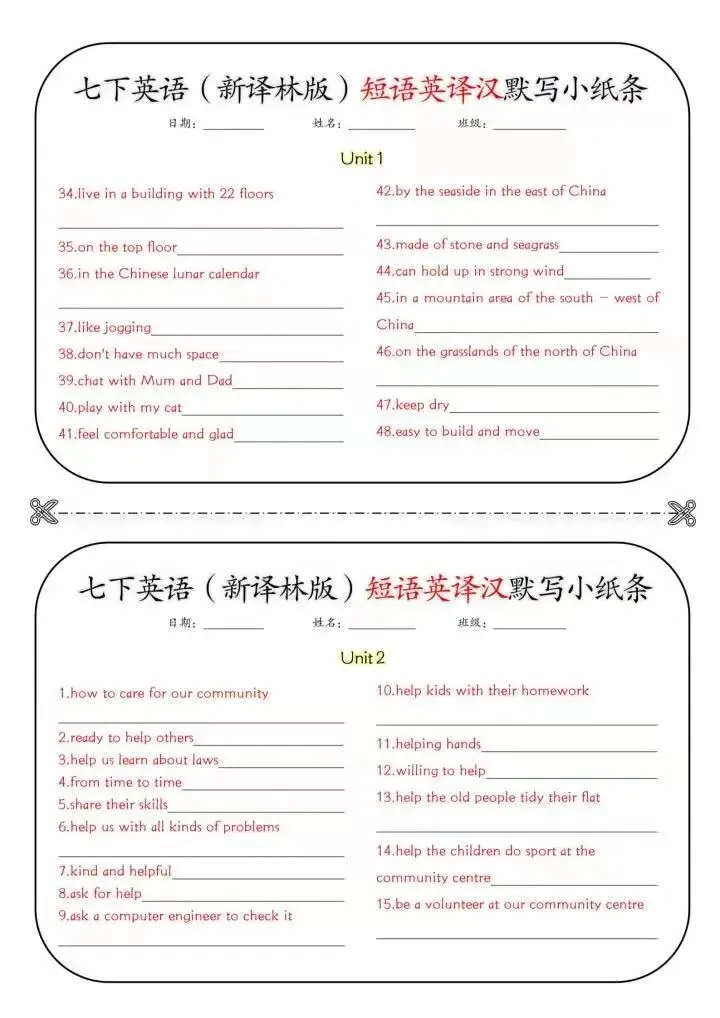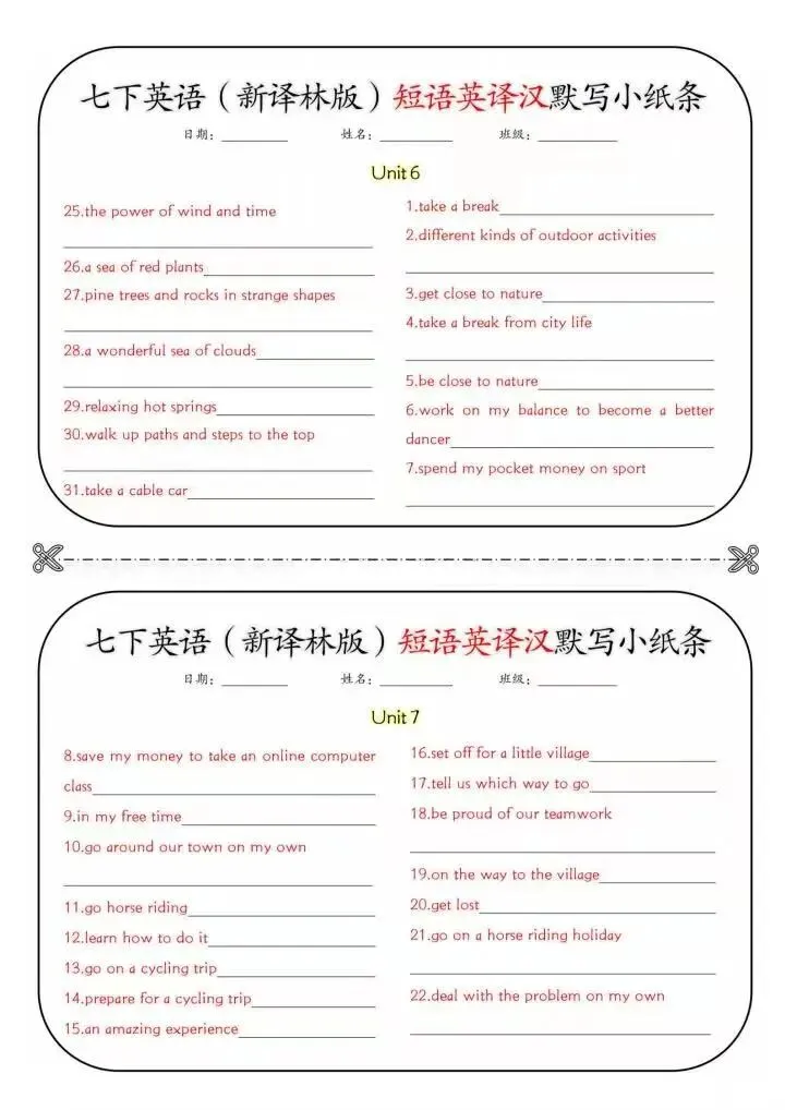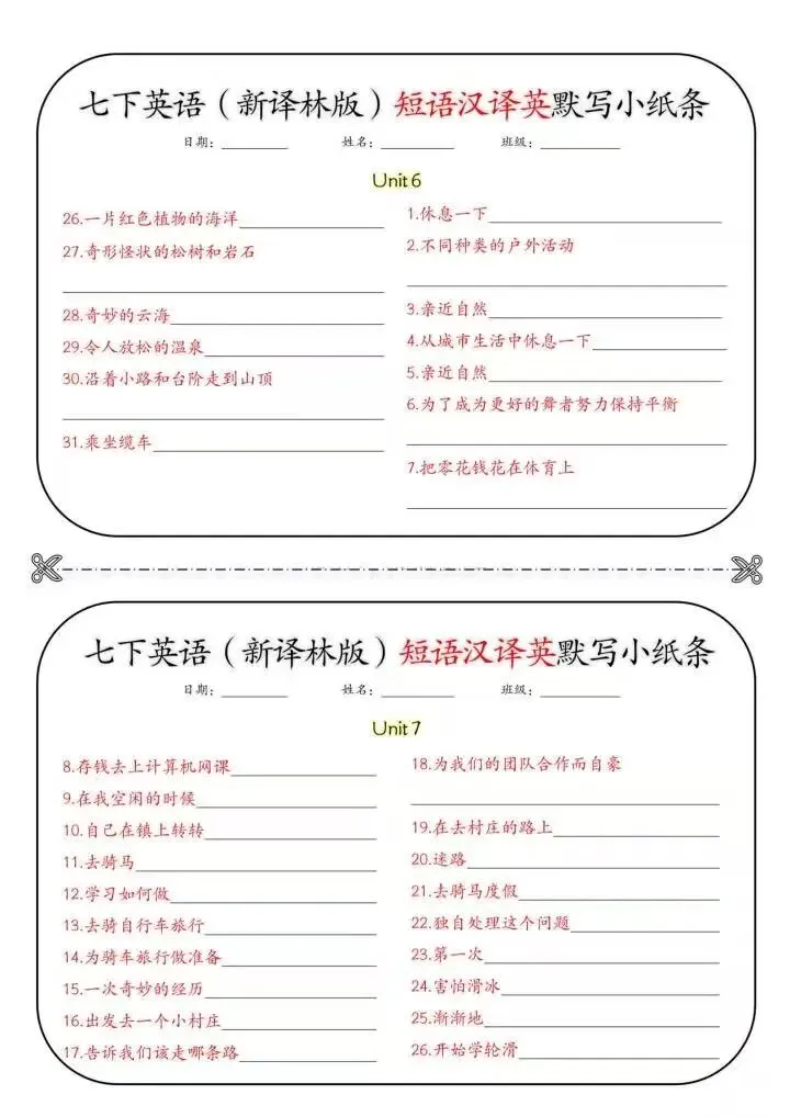 2026春新(译林版)七年级下册英语【短语英泽汉+汉泽英默写小纸条】电子版可下载打印!