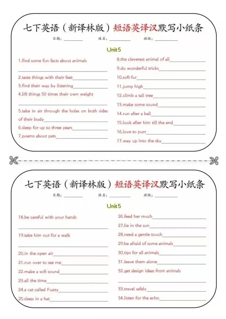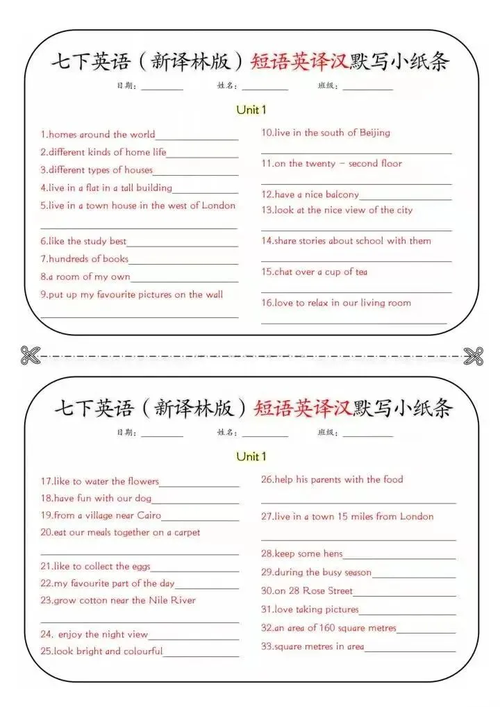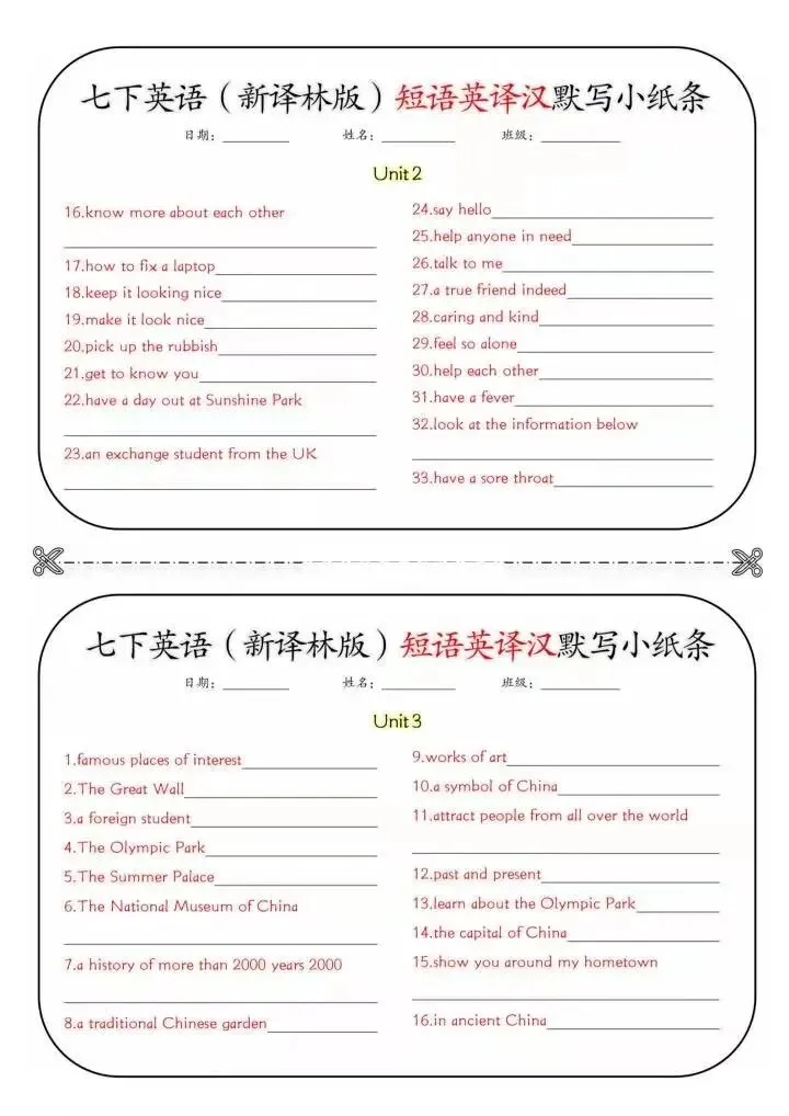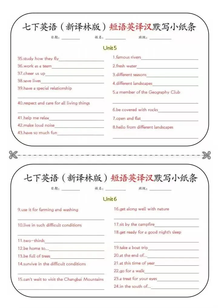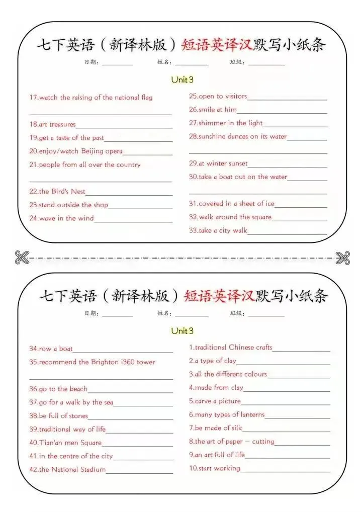 2026春新(译林版)七年级下册英语【短语英泽汉+汉泽英默写小纸条】电子版可下载打印!
