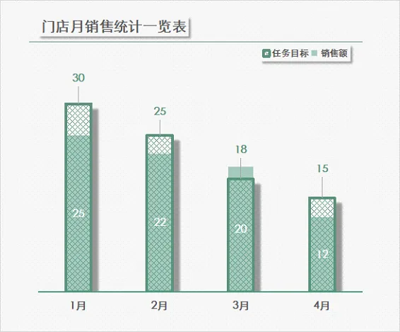 今天我们给大家分享的图表是重叠柱形图,它可以直观展示完成量与目标值的差距效果,如下。