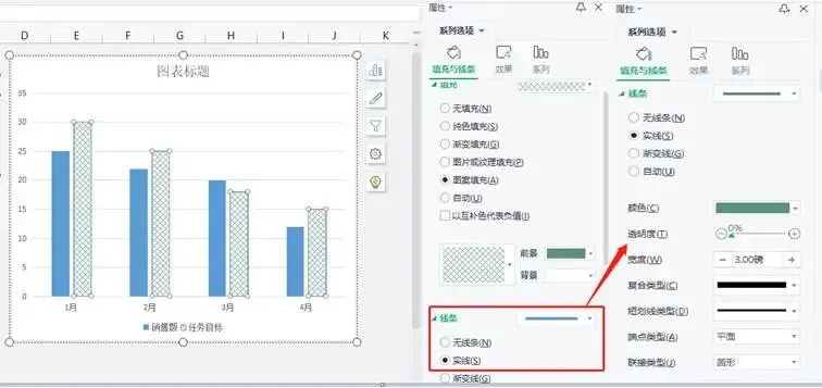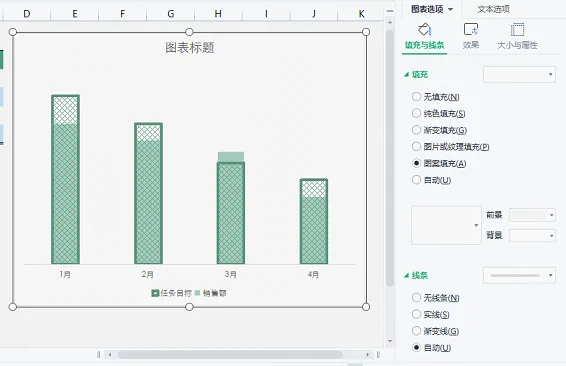 2.点击图表橘色柱形,设置成图案填充,线条为实线,颜色值(R:94/G:146/B:123)。设置参数如下图所示。