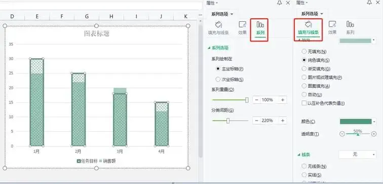 (小提示:当前是销售量柱形覆盖在目标柱形上方,为了能看出销售量等于或大于目标量时两者的关系,我们设置销量柱形的填充具有透明度。)