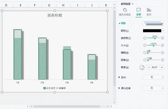 ②点击任务目标柱形,添加【阴影】效果,设置参数如下图所示。