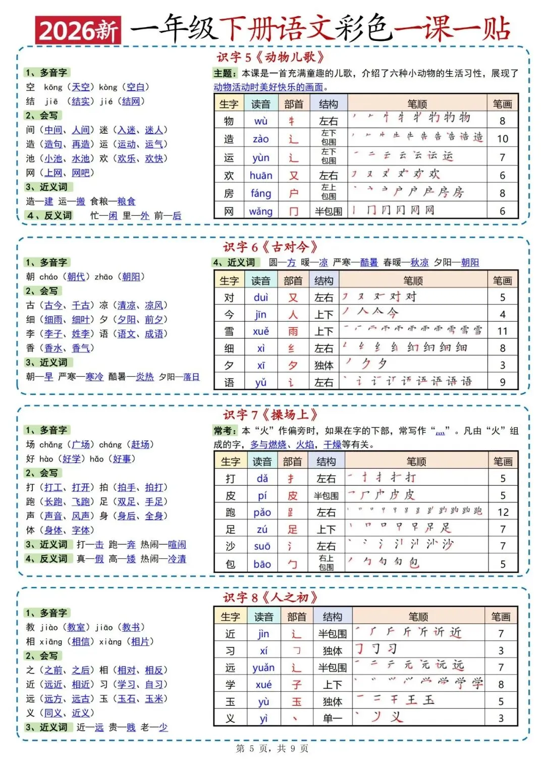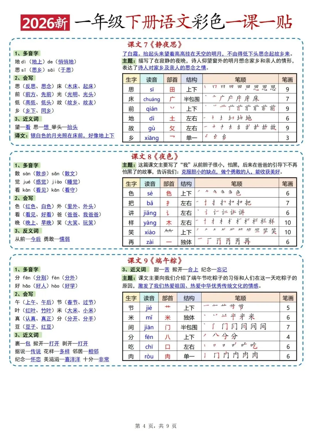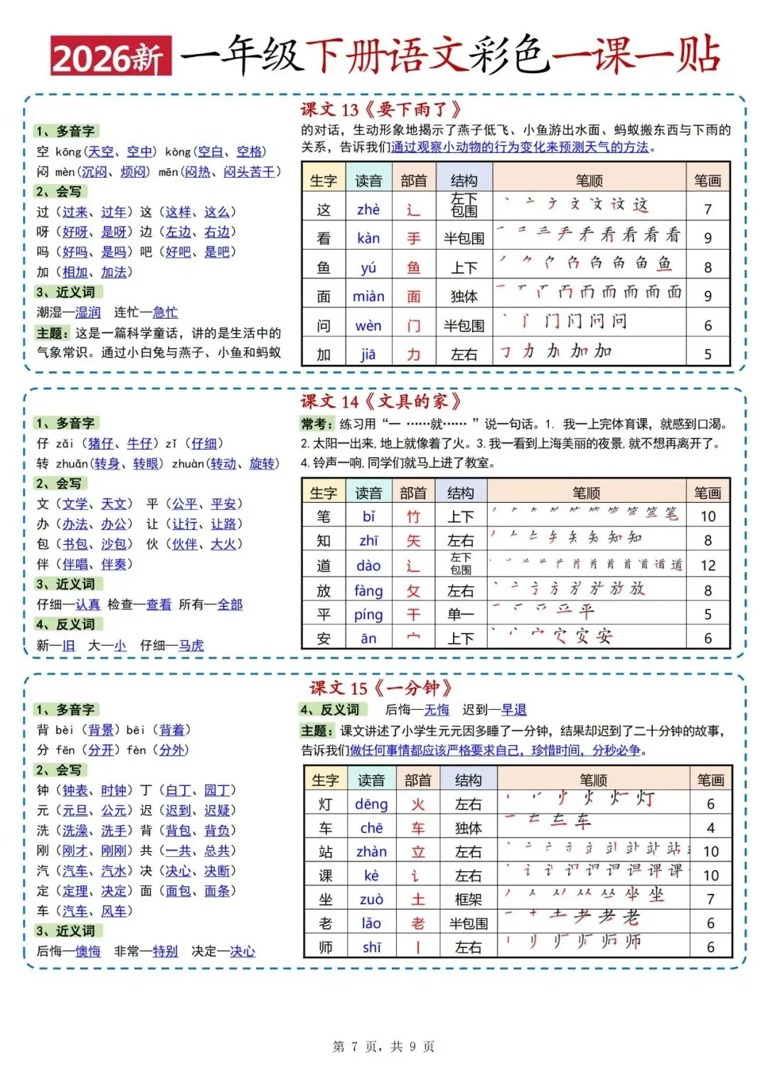 26春新一年级下册语文彩色一课一贴课课贴 电子版9页可打印。
