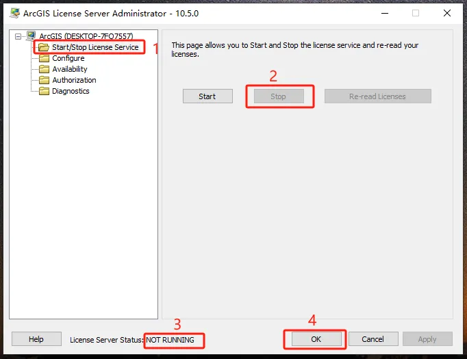 第十一步:选择【Start/Stop License Service】,然后点【stop】,下方显示为【NOT RUNNING】,然后点【OK】.