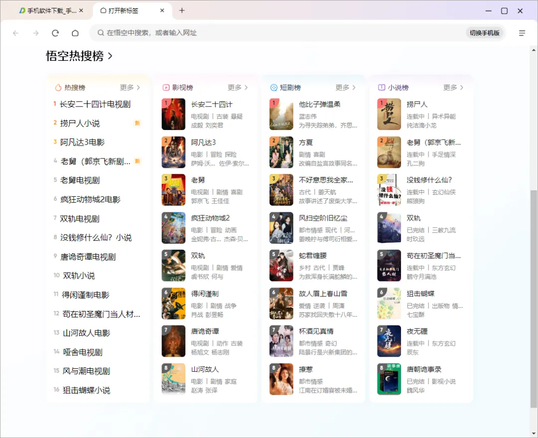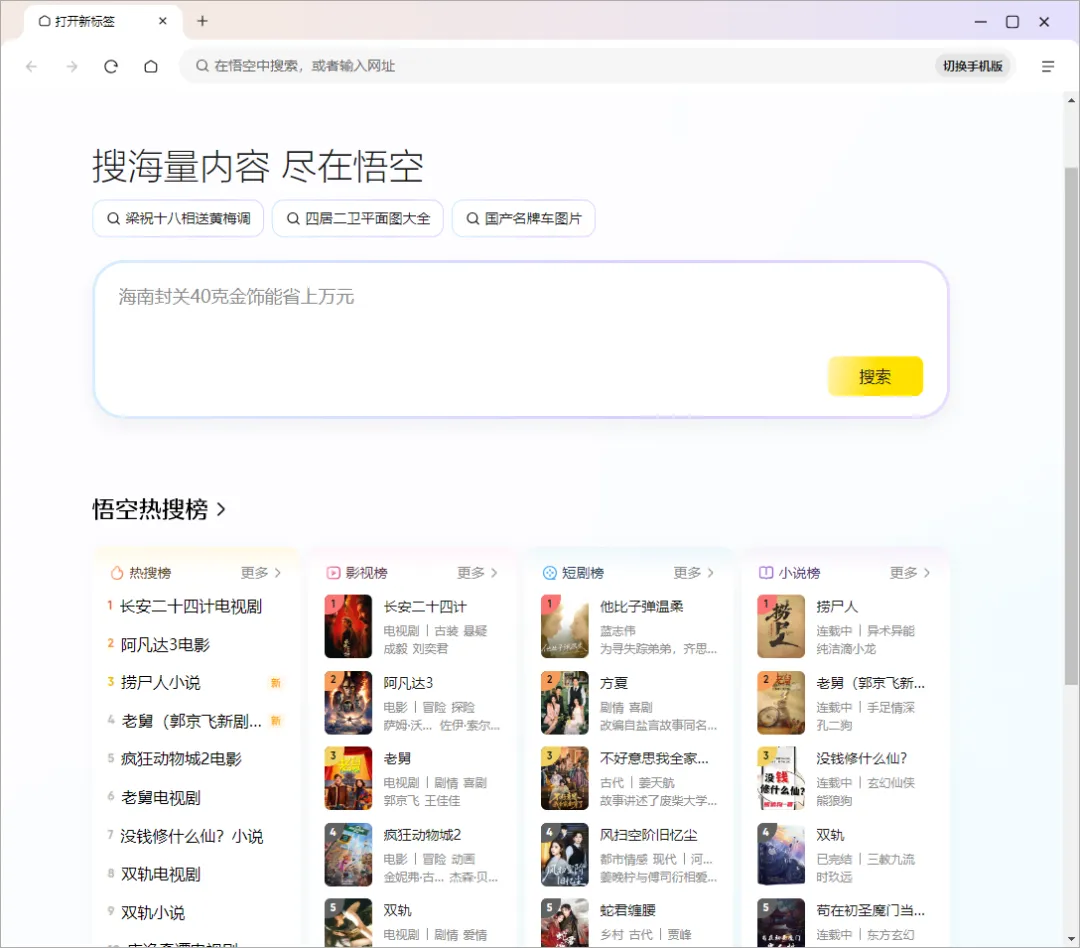 | 悟空浏览器电脑版是抖音旗下的一款多功能内容搜索神器。它拥有简洁直观的界面设计,还拥有高效的网页加载速度,让用户能够轻松浏览网页、搜索信息、观看视频。既能追剧,又能看小说,短剧,满足不同用户的使用需求。同时,悟空浏览器一旦检测到原网页可能存在不良广告,就会自动开启清爽模式,减少网页中的广告干扰,大大提升了用户的浏览体验。如果你不知道看什么,这里还有影视、小说、短剧各类榜单,强大的搜索功能也可以为你推荐,总能找到你感兴趣的内容。感兴趣的兄弟们快来下载试试吧~ | |