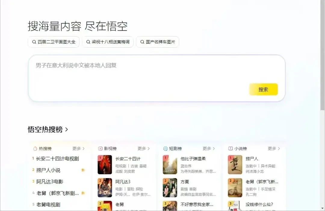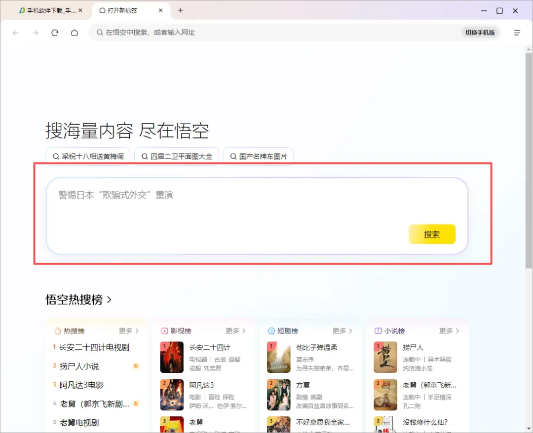 2、搜索栏输入关键词,体验AI智能搜索,视频和资讯,一搜就能看