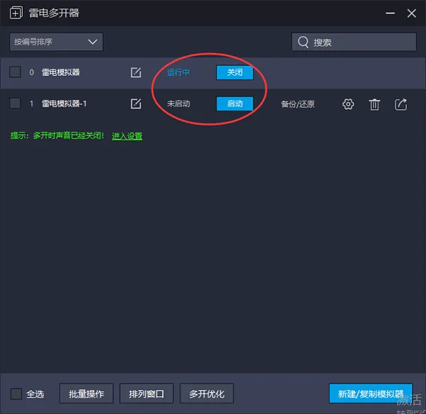 可以对点击的模拟器进行备份,或者是还原操作。处于启动的状态的模拟器是无法在雷电多开器界面创建快捷方式,设置,删除,备份还原等操作的。