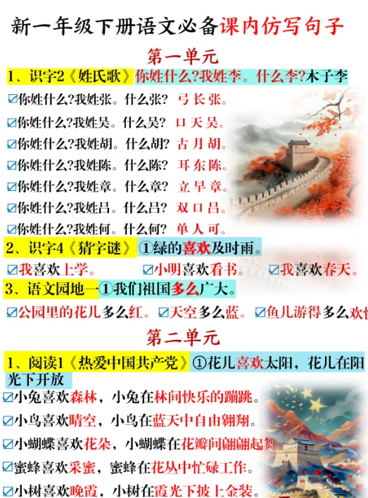 - 一年级下册语文课本全部重点仿写句型(按课文顺序编排)