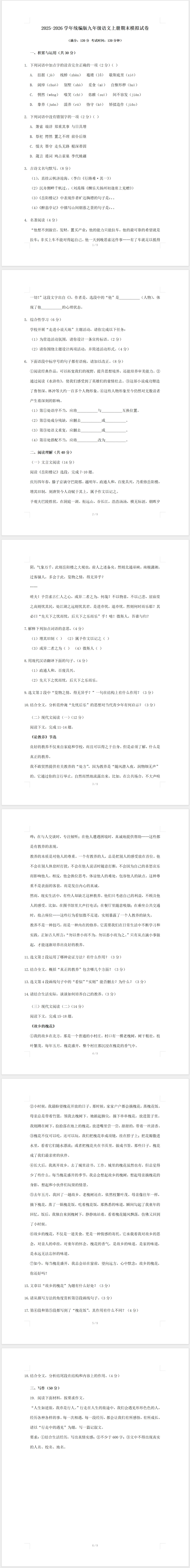 【免费分享】2025-2026学年统编版九年级语文上册期末模拟试卷(卷末附答案)-PDF可打印