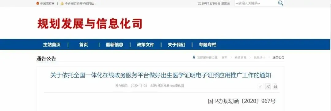 12月8日,国家卫健委发布了“关于依托全国一体化在线政务服务平台做好出生医学证明电子证照应用推广工作的通知”,提出明年年底前,出生医学证明电子证照将实现在全国一体化平台全面深度应用。
