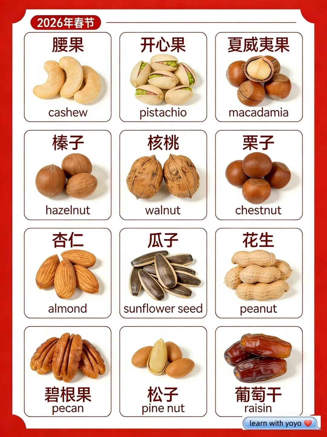榛子 hazelnut、松子 pine nut、花生 peanut、瓜子 sunflower seed,