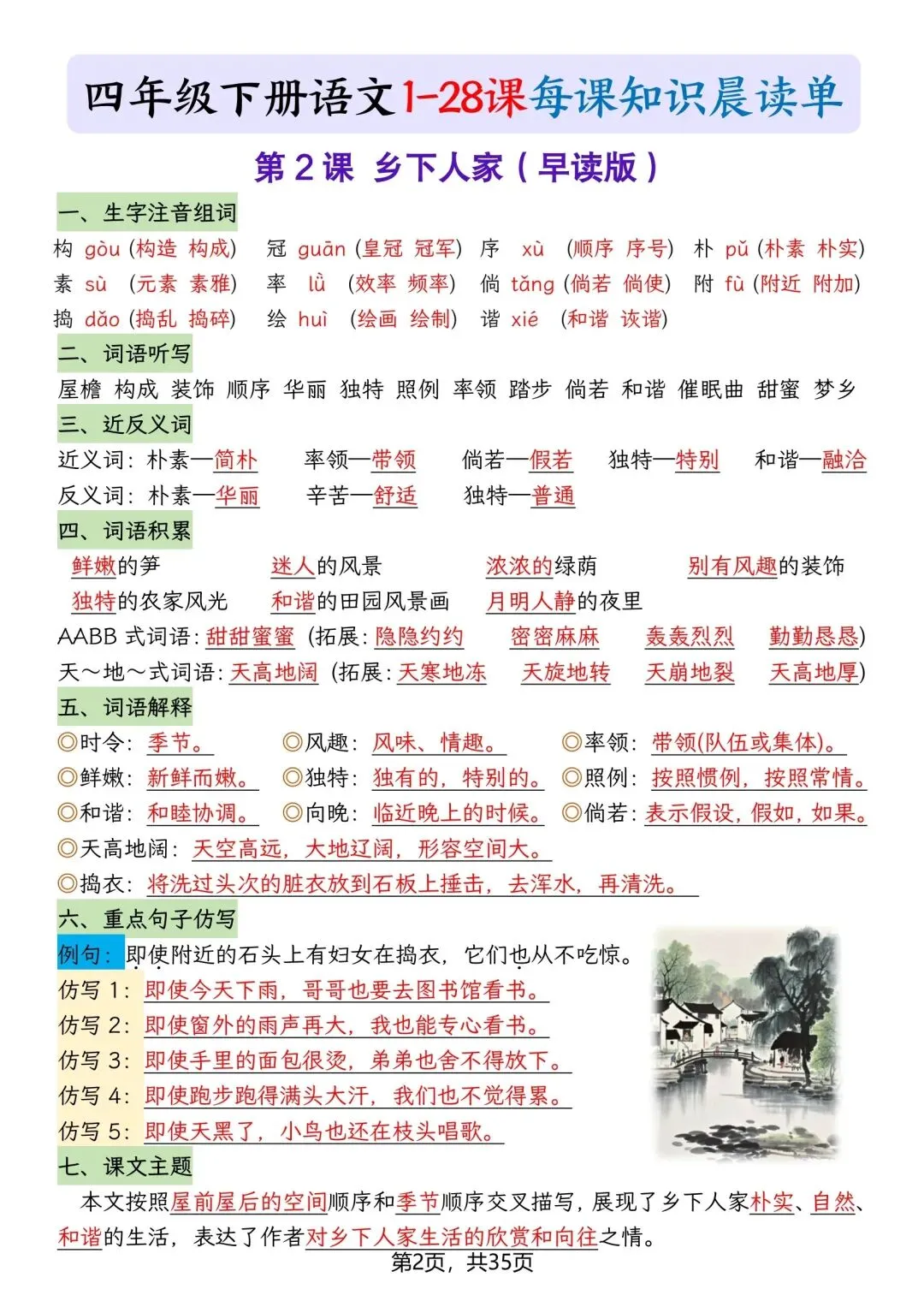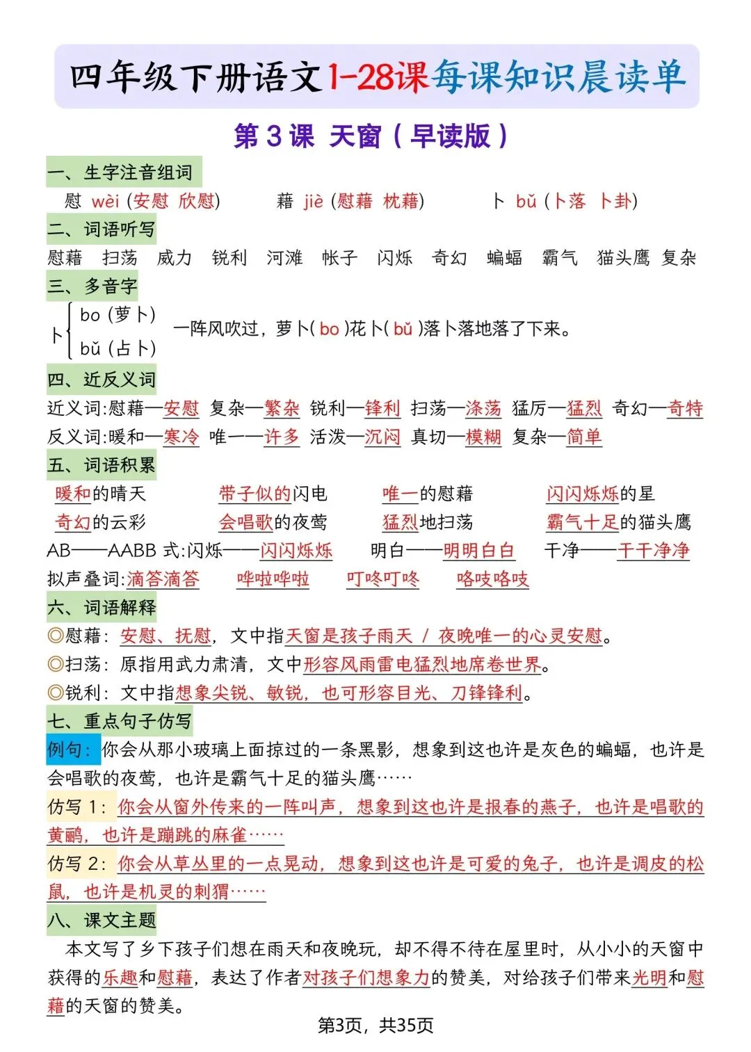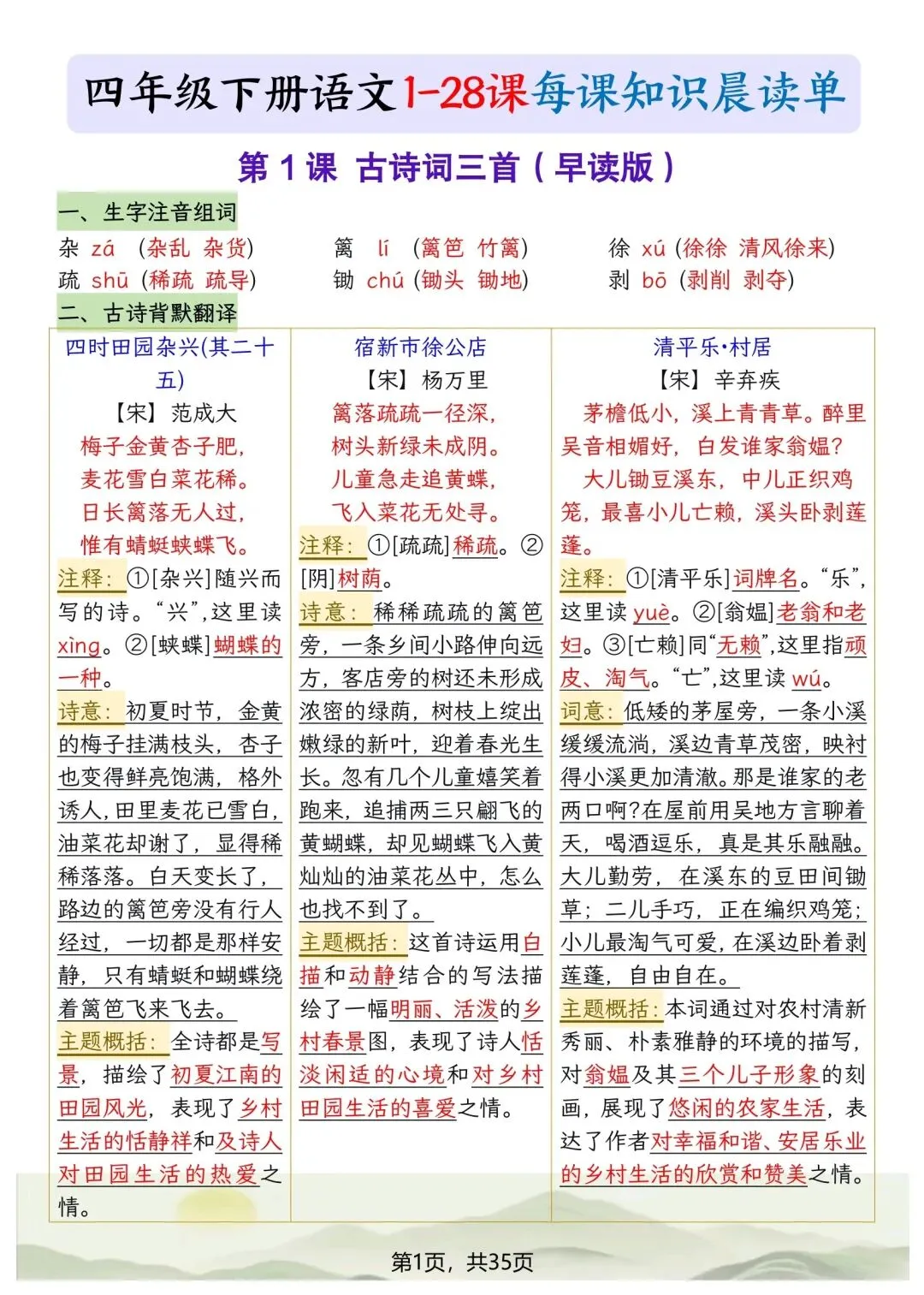 本期分享:26春四年级下册语文每课知识晨读单,如果觉得不错的话,可以转发分享到班级群/年级群,让家长打印出来,帮助孩子学习哦!