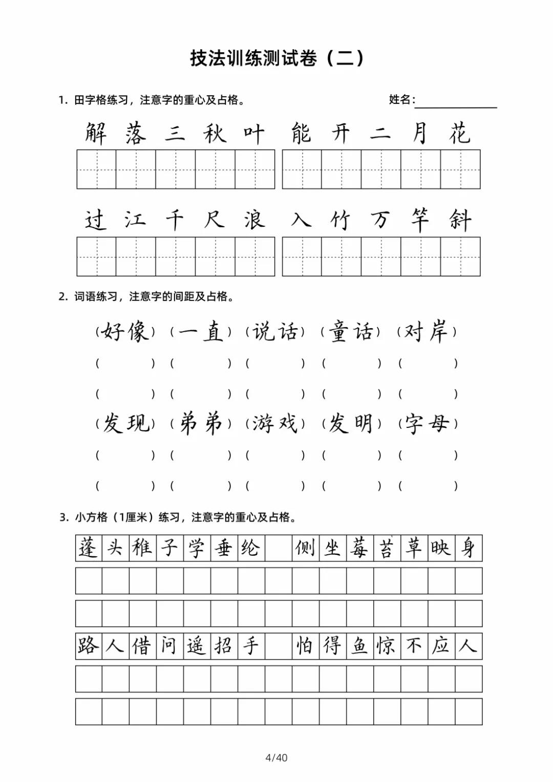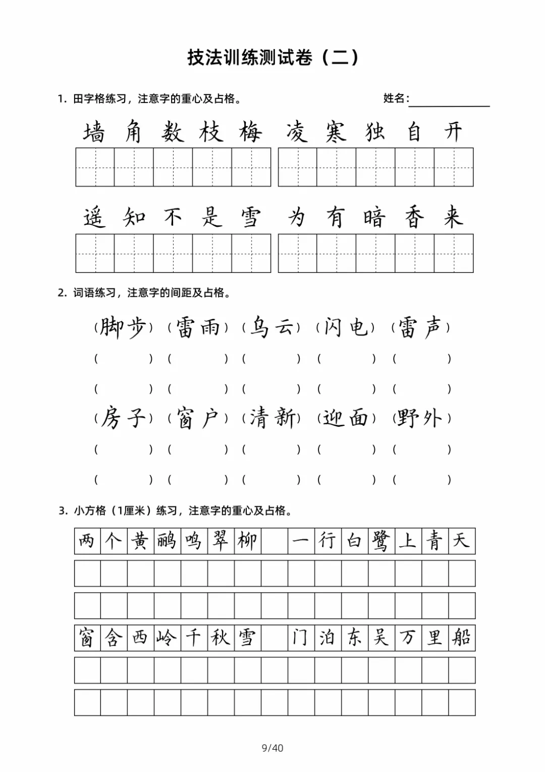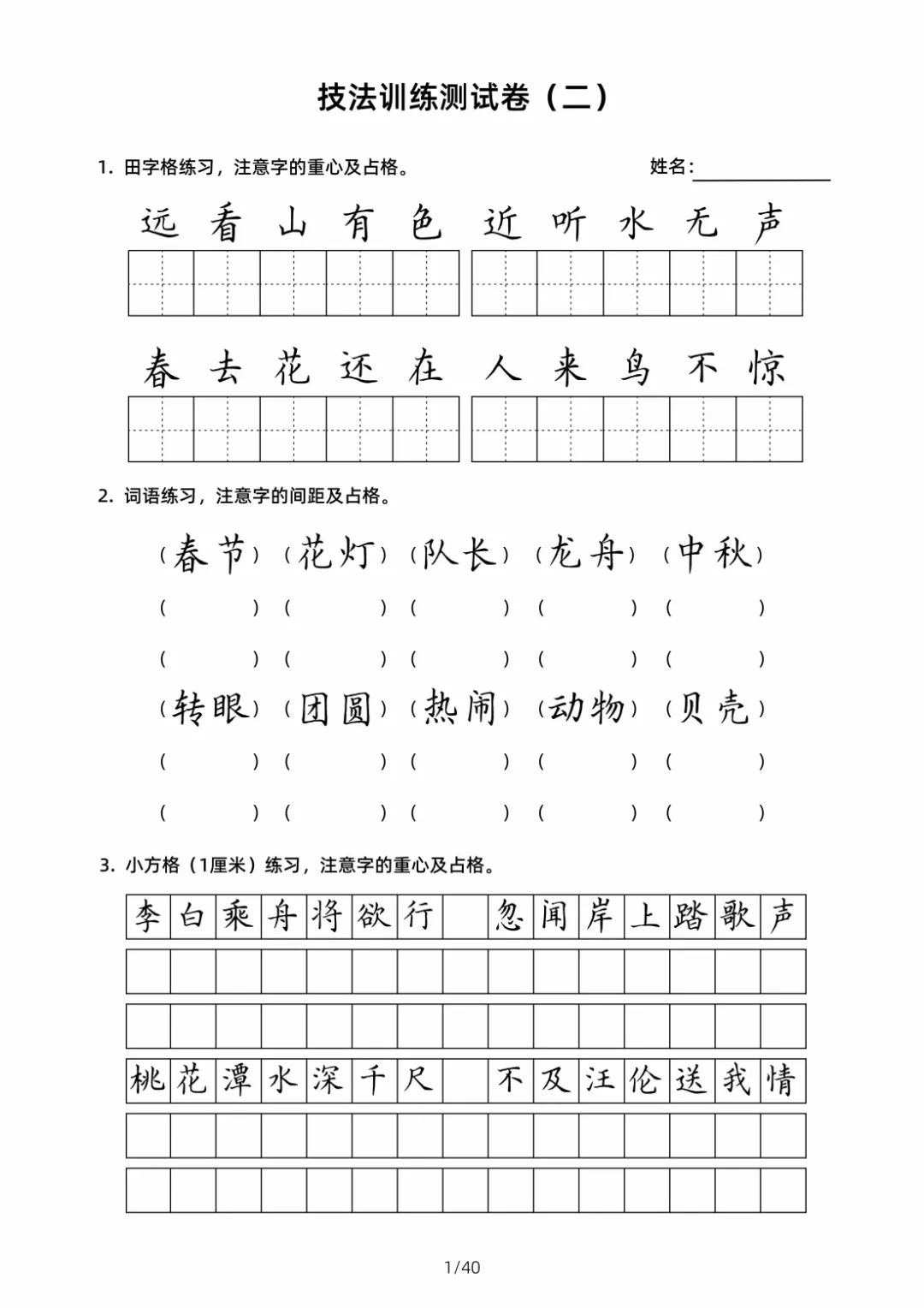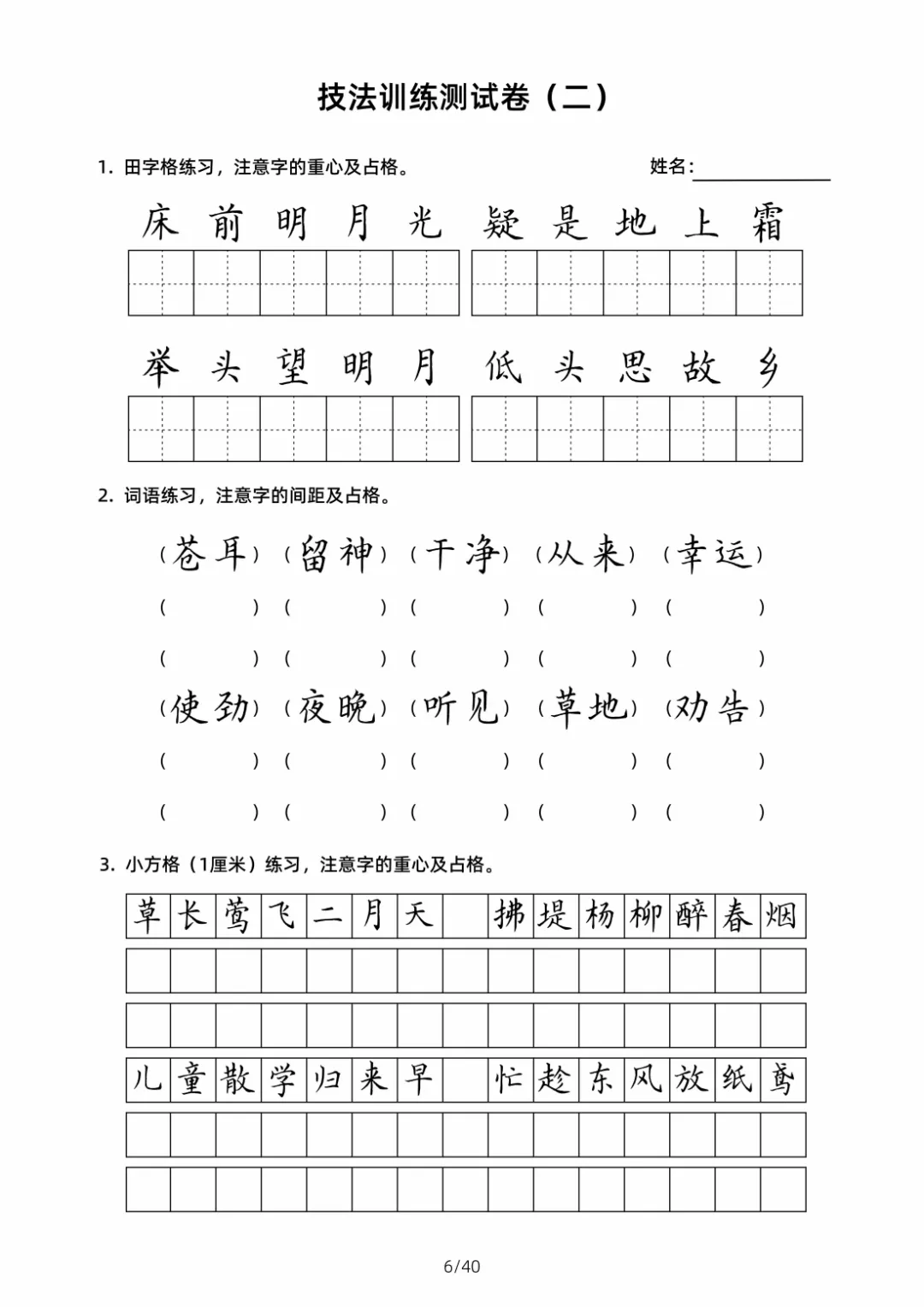 硬笔书法规范字技法训练【2】40页高清文档 书法技法训练是一个系统且循序渐进的过程,核心围绕 “笔法、结构、章法” 三大维度展开,需结合科学方法与长期实践。以下从基础准备、核心技法训练、进阶提升三个层面,详细拆解可落地的训练技巧,帮助学习者高效掌握书法要领 。