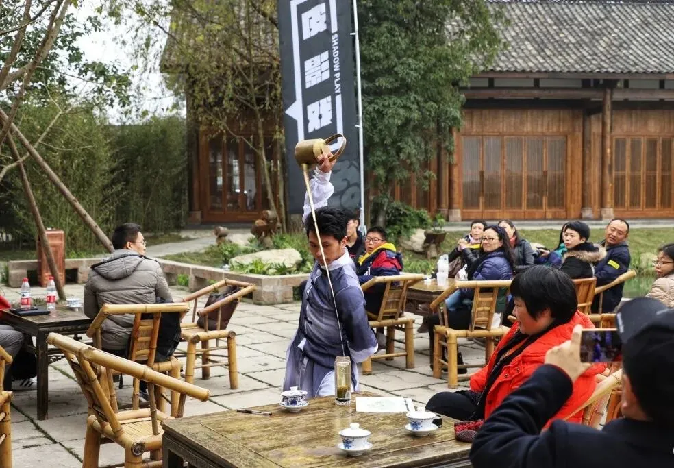 成都人不仅喜欢喝茶,还喝得很讲究。掺茶的服务员是茶博士,长嘴壶倒茶,还当剑耍。