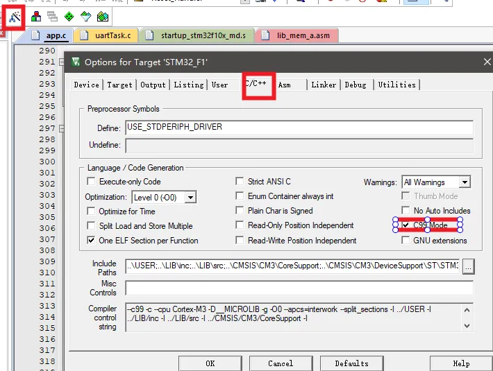 keil软件的C99模式 有没有遇到过“..\APP\app.c(325): error: #268: declaration may not appear after executable statement in block”类似这样的错误。 这说明有的数据定义在了函数执行语句后面。 这是由于没有使能c99标准,导致数据定义的位置必须在最前面, 解决办法: 打开c99模式:
