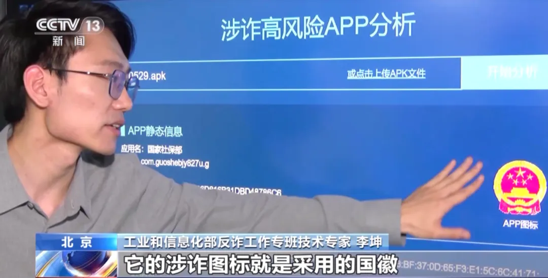 工业和信息化部反诈工作专班技术专家李坤介绍,通过上传App的安装包,可以分析App的静态信息和动态信息。静态信息主要包含一些外在特征,以“国家社保部”这个虚假App为例,涉诈图标采用国徽,名称盗用了国家社保部(人社部)的名字。