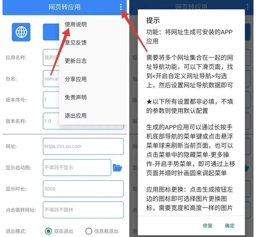 软件的右上角三个点里面也有使用教程,大家可以看一看,当所有信息都填写完毕后,点击生成按钮即可生成APP,生成后就会跳出安装的按钮,点击安装即可