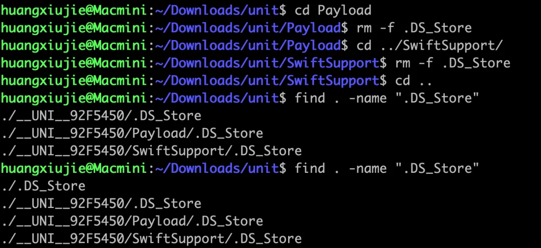 期间还有一个小插曲,经过上述操作提交ipa还是被Transporter打回来了,理由是ITMS-90430: Invalid Swift Support - The file .DS_Store doesn’t have a signing ID. Sign the file, rebuild your app using the current public (GM) version of Xcode, and resubmit it.原因是在Finder里操作,会有万恶的.DS_Store这个文件,而它在Finder又不是可见了,于是就使用终端,使用命令行查看文件在哪儿然后删除它就行了。