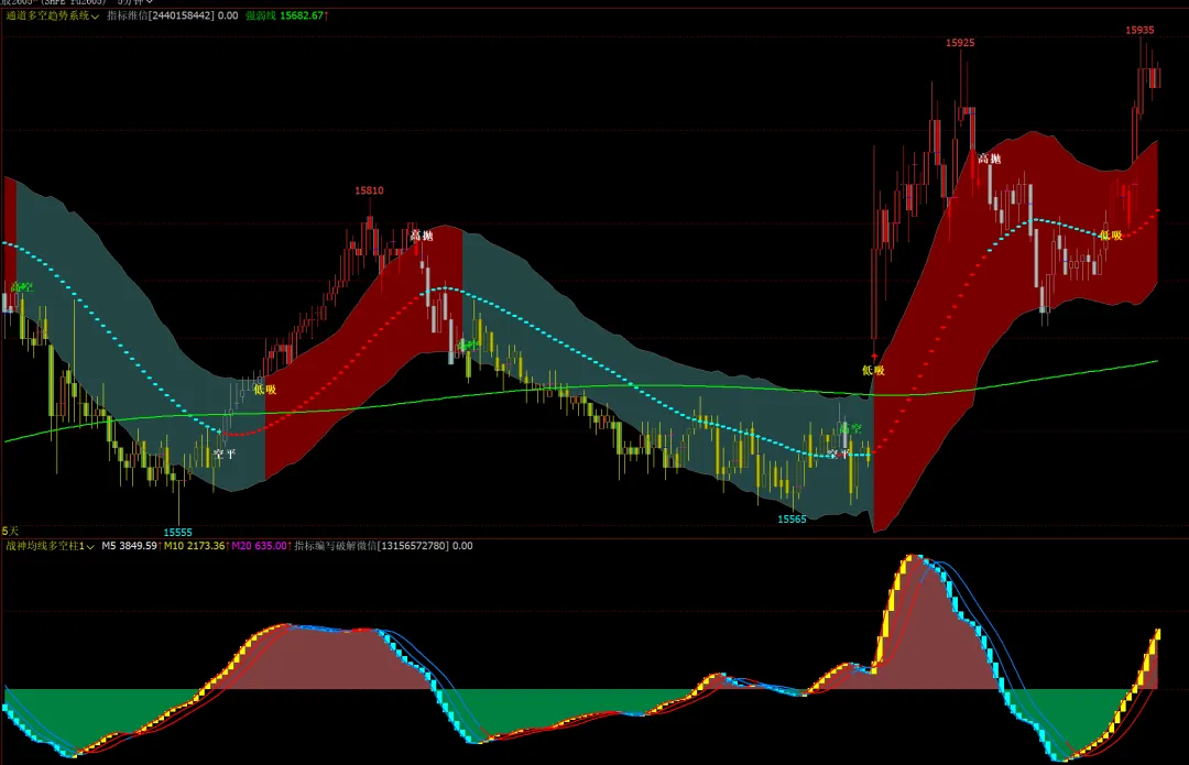 1、通道多空趋势系统主图,战神均线多空柱幅图