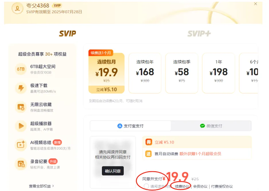 夸克网盘续费必须要按这个同意并支付,相当于同意了每个月自动扣费的条款。如果你只是想体验一个月,为了不让它持续扣钱,你必须要马上关掉这个自动续费的功能。