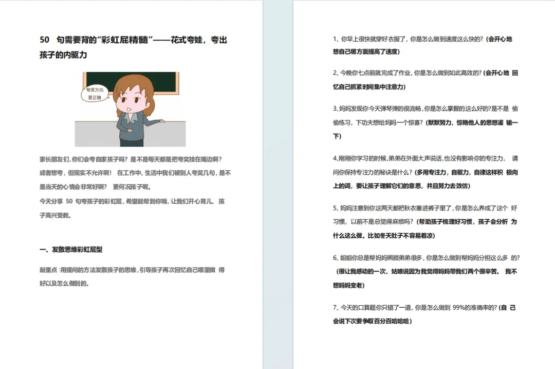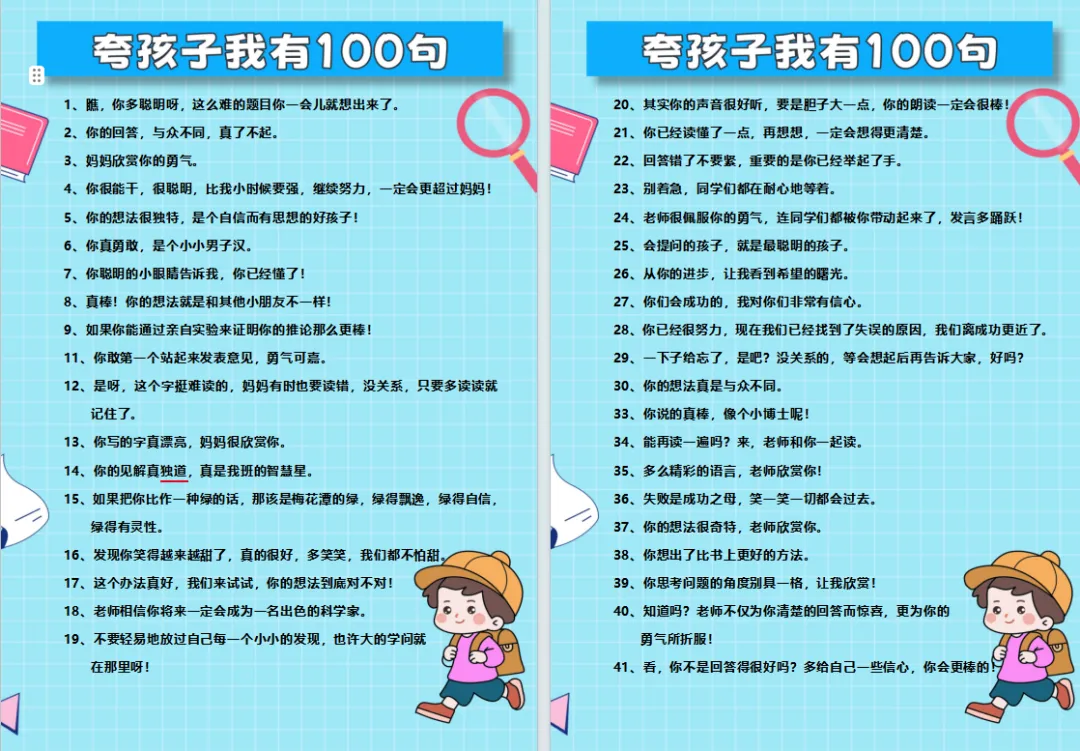 同时,当孩子做得好的时候,应多夸夸孩子。并非只是片面的夸奖,真正有效的夸奖应该是能够跨出孩子的内驱力和自信!以下正确“彩虹屁”方式分享给各位家长🔽