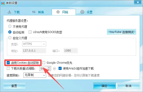 软件默认开启“启用Cookies自动获取”功能,可以自动识别电脑中默认浏览器目前所需下载视频的网站中的cookie信息,直接实现视频识别与下载。