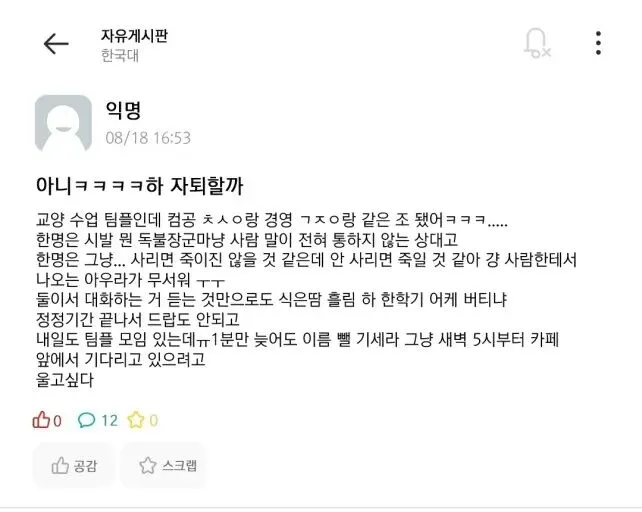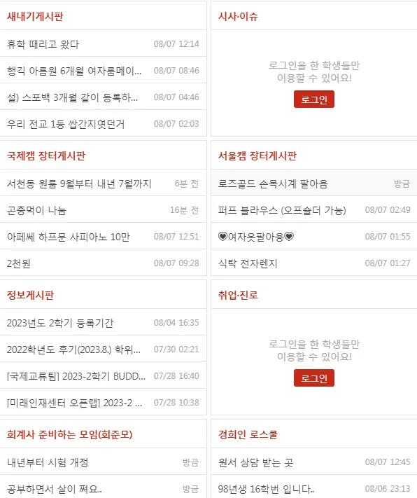 ‘寻找放假期间在学校的饭搭子!’、‘能给我讲解这道数学题的人?‘、‘原价4.2万韩元的曼昆经济学课程教材2万韩元出售。‘这些都是韩国国内最大的大学生活综合网站“Every Time”实时上传的文章。