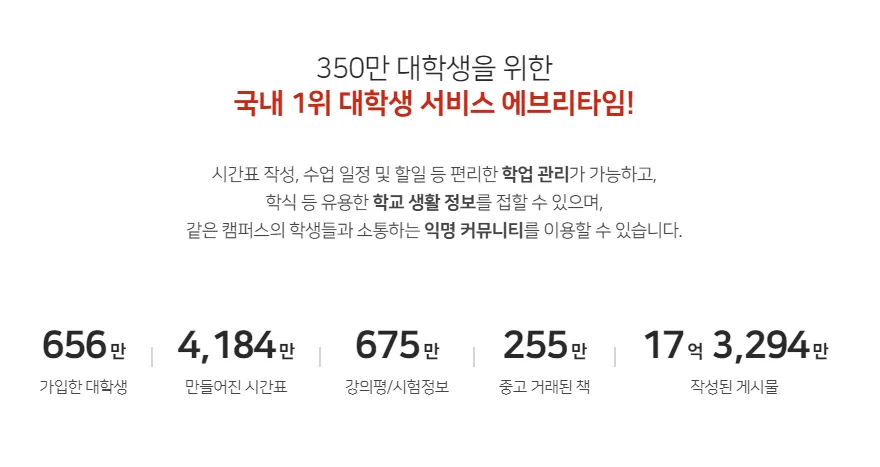 当时,”Every Time”只是用户制定时间表,并与朋友相互共享时间表的应用程序。但随着逐渐出现相互讨论多种主题、分享苦恼的匿名”自由留言板”、可以获得学校相关各种信息的”信息留言板”、进行二手交易的”集市留言板”等,渐渐地,Every Time成长为韩国大学生活综合门户网站。
