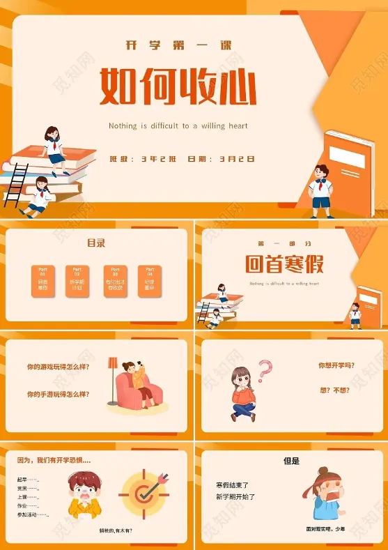 橙色卡通简洁寒假开学如何收心班会PPT模板