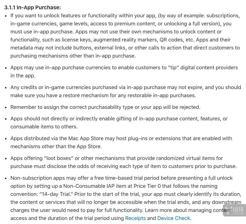 在最新的 App Store 指南 3.1.1 条款中,苹果表示:“App 现在能够提供一个免费试用期选项来开放应用的所有或部分功能,可以将试用期标注为14天或其他时长。在试用期开始之前,开发者必须明确标注在试用期结束之后相关功能、服务就会关闭,提醒用户为所有服务付钱。”