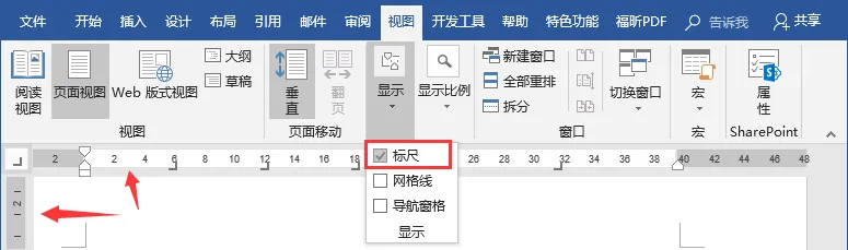 点击【视图】-【显示】组,勾选“标尺”复选框,将在界面中显示出水平标尺和垂直标尺。