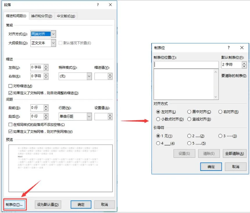 点击【开始】-【段落】组右下角的“段落对话框启动器“按钮,打开”段落“对话框,然后单击”制表位“按钮,打开”制表位“对话框。