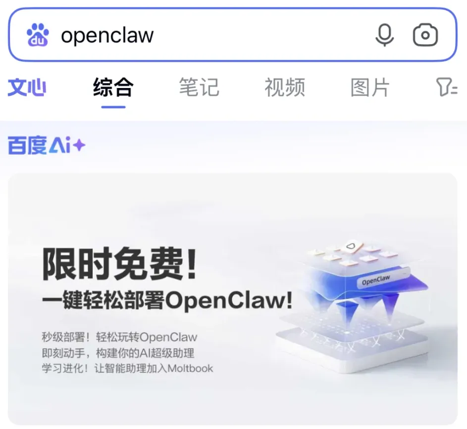 方法很直接,在百度App中搜索“open claw”,看到第一条大大的限时免费的banner图,点进去就行(注意,如果在百度网站上搜,结果就变成百度智能云的OpenClaw广告了):