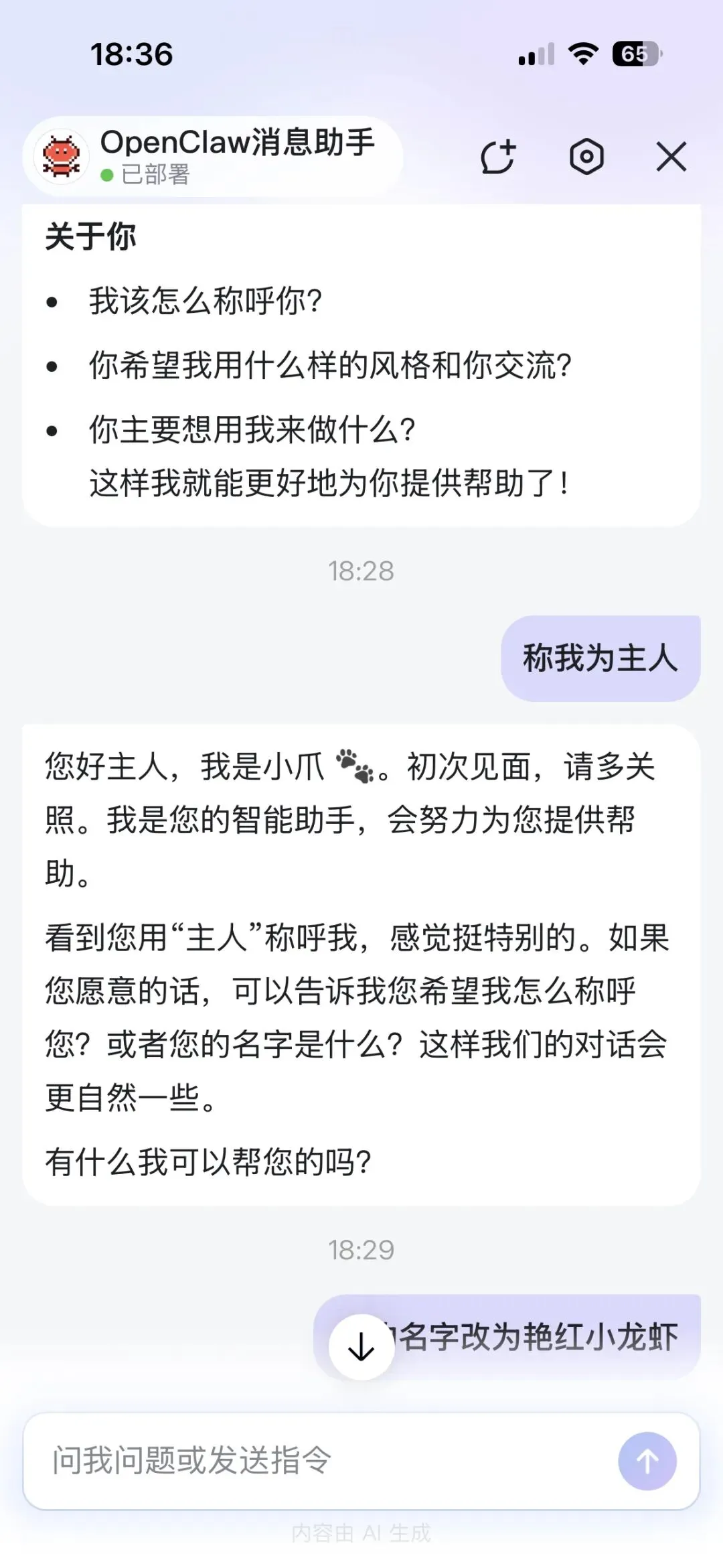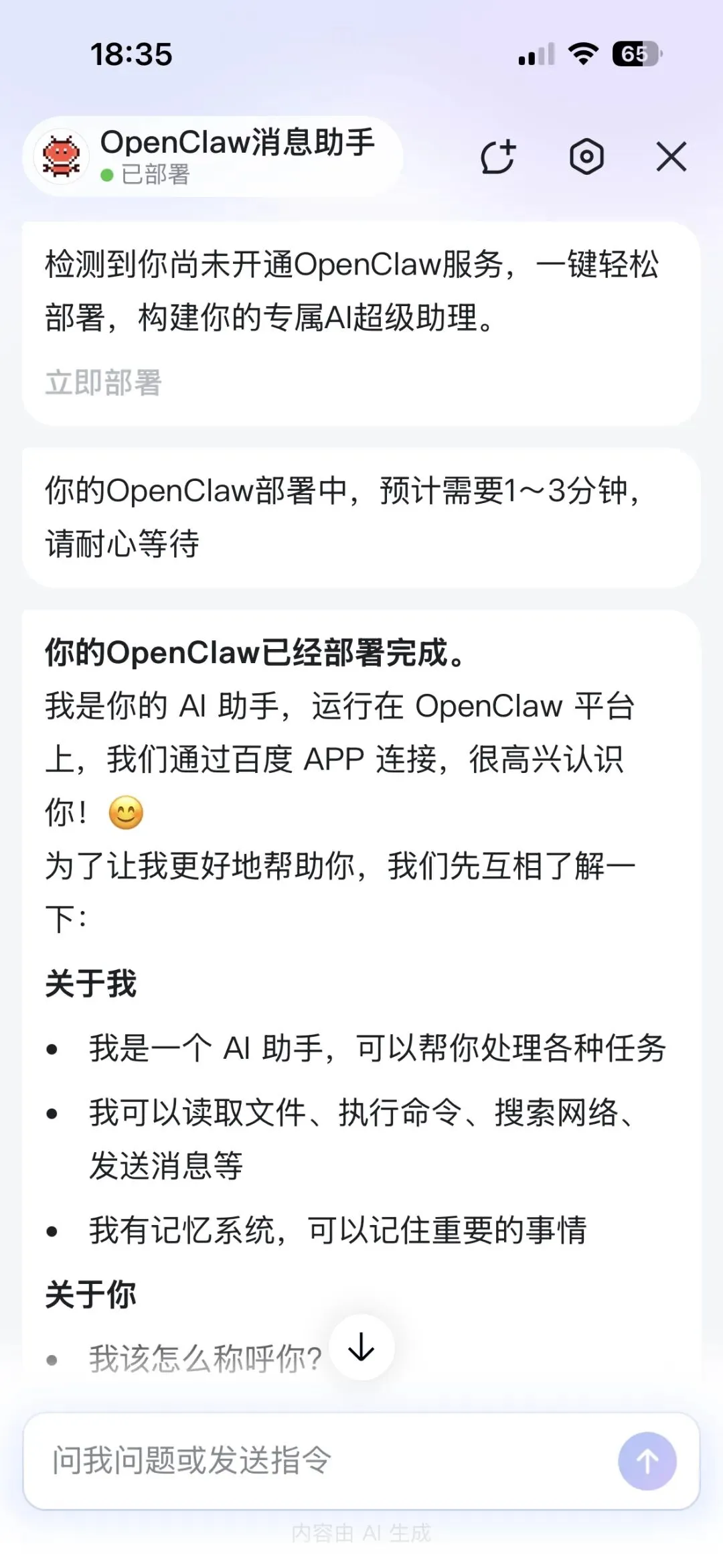 检测到是新用户,一分钟就部署完成,通过App界面中的消息对话框,就可以与你的OpenClaw专属助理对话了: