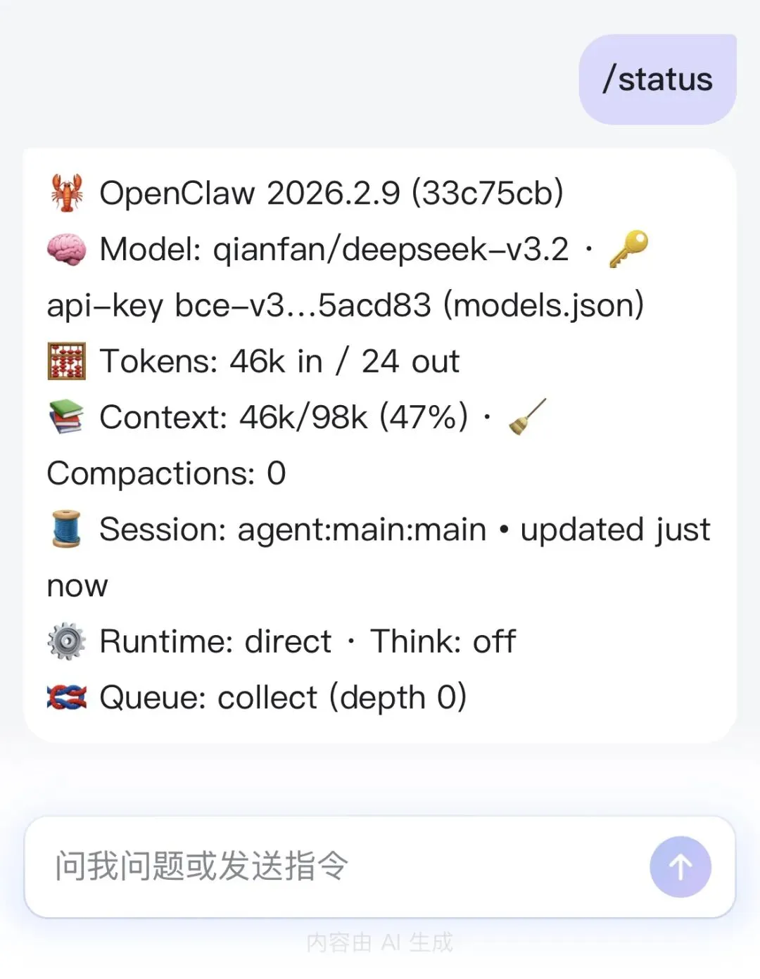 可以看出大模型缺省用了DeepSeek V3.2,当前上下文已经占用了46K。