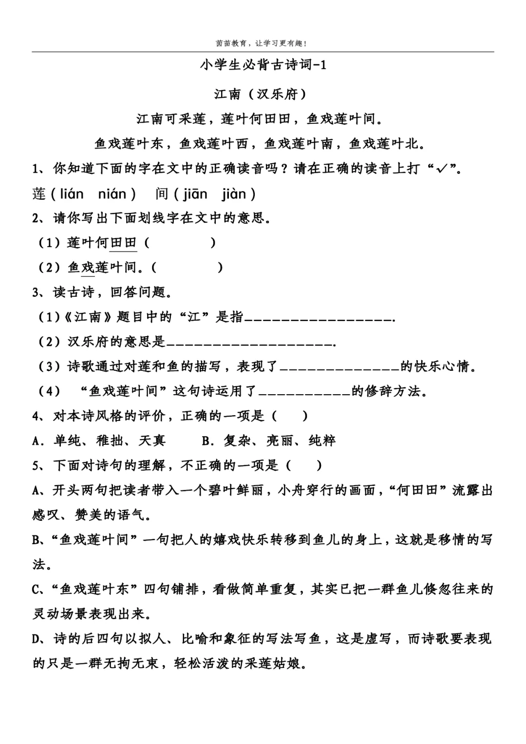 (1)《江南》题目中的“江”是指_长江_______________.