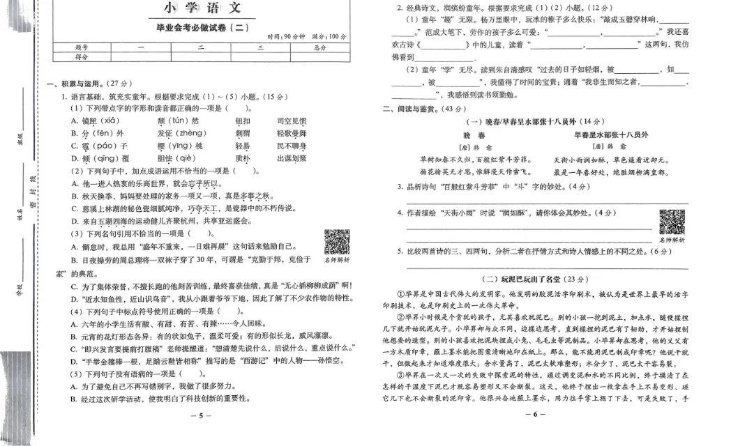 最新整理《小学毕业升学必做的16套试卷(可打印)》语文(附下载链接免费领取)