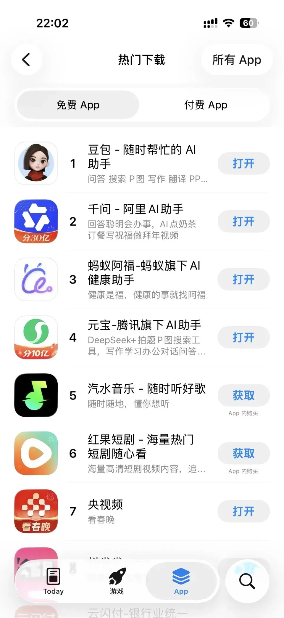 马年开年即王炸!2026 年 2 月 17 日,字节跳动旗下豆包 App 强势登顶苹果 App Store 中国区免费应用总榜第一,反超一众竞品,拿下春节档 AI 应用桂冠。这不仅是一次榜单跃升,更是国产 AI 从技术突围到全民认可的里程碑,值得全网点赞喝彩!