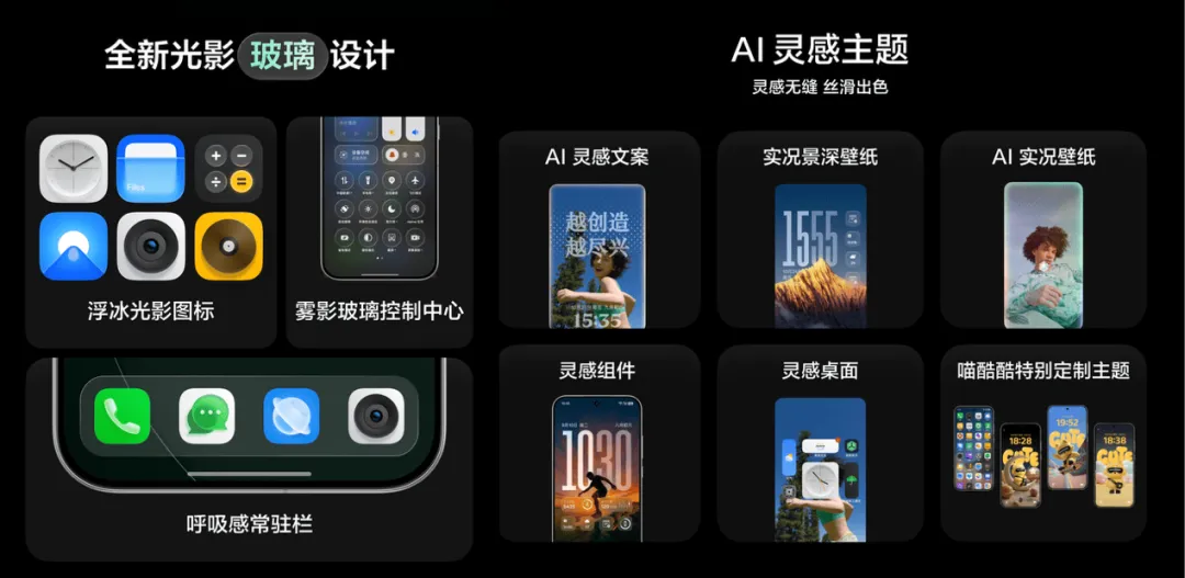 系统采用高透明度处理与柔和模糊层技术,使信息层次清晰可辨,营造出纯净、开放的视觉体验。浮冰光影图标通过恰到好处的间距与网格化秩序,呈现呼吸般自然的轻盈节奏,让每一次交互都充满生命感。雾影玻璃控制中心和呼吸感常驻栏进一步强化了系统的通透立体质感,让整个界面”处处都精致”。