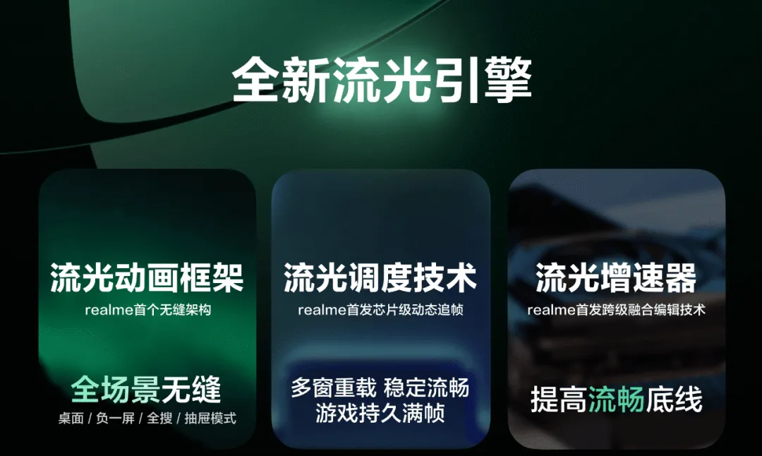 realme UI 7.0搭载了全新的流光引擎,通过流光动画框架、流光调度技术和流光增速器三大核心技术,实现全场景的无缝丝滑流畅体验。