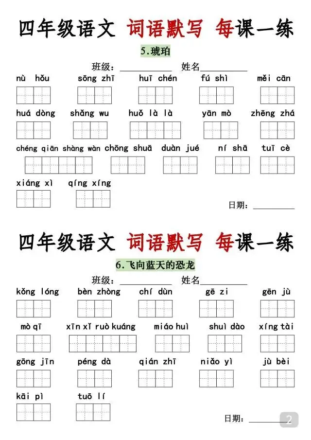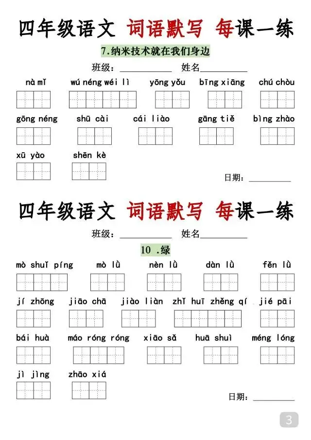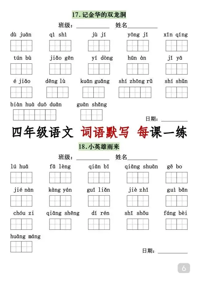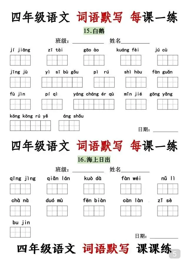 四年级下册语文词语默写每日一练来啦!同步课本重点篇目,按课编排看拼音写词语练习,覆盖课内高频、易错字词,配套完整参考答案,每日一练夯实字词基础,提升书写与默写能力,课前预习、课后巩固、日常积累都适用~