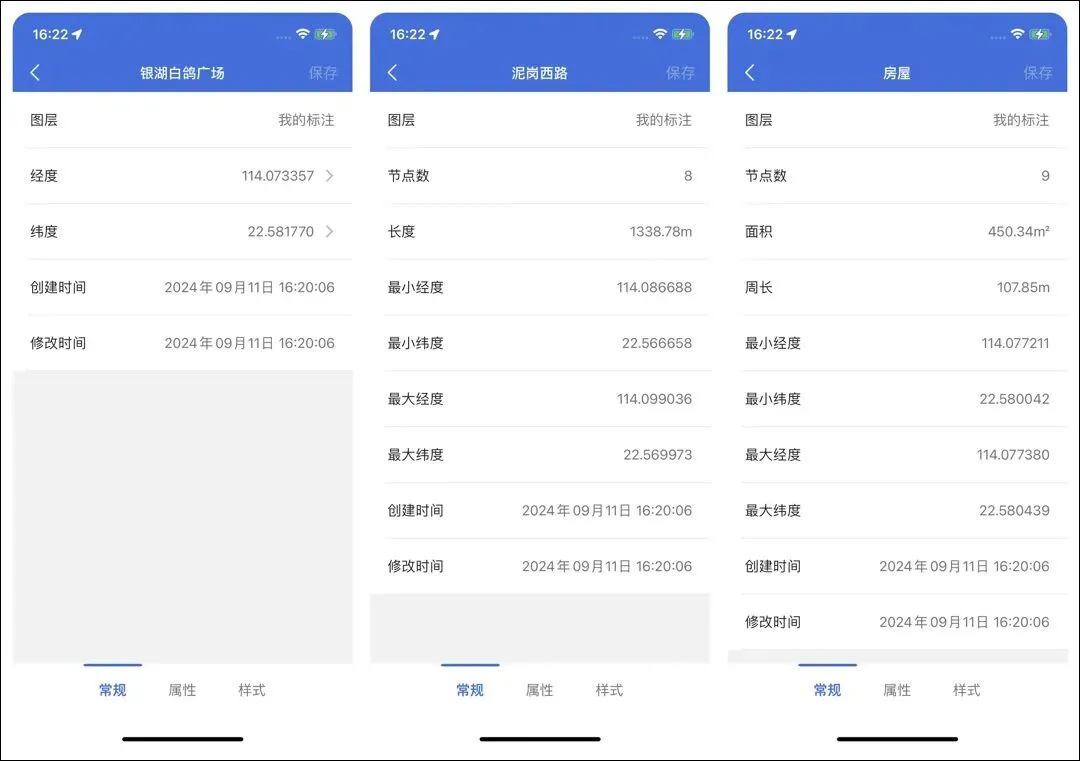 对属性字段值及基本信息的管理,除了共有的一些属性参数以外,不同要素类型也会有自己独有的属性参数。
