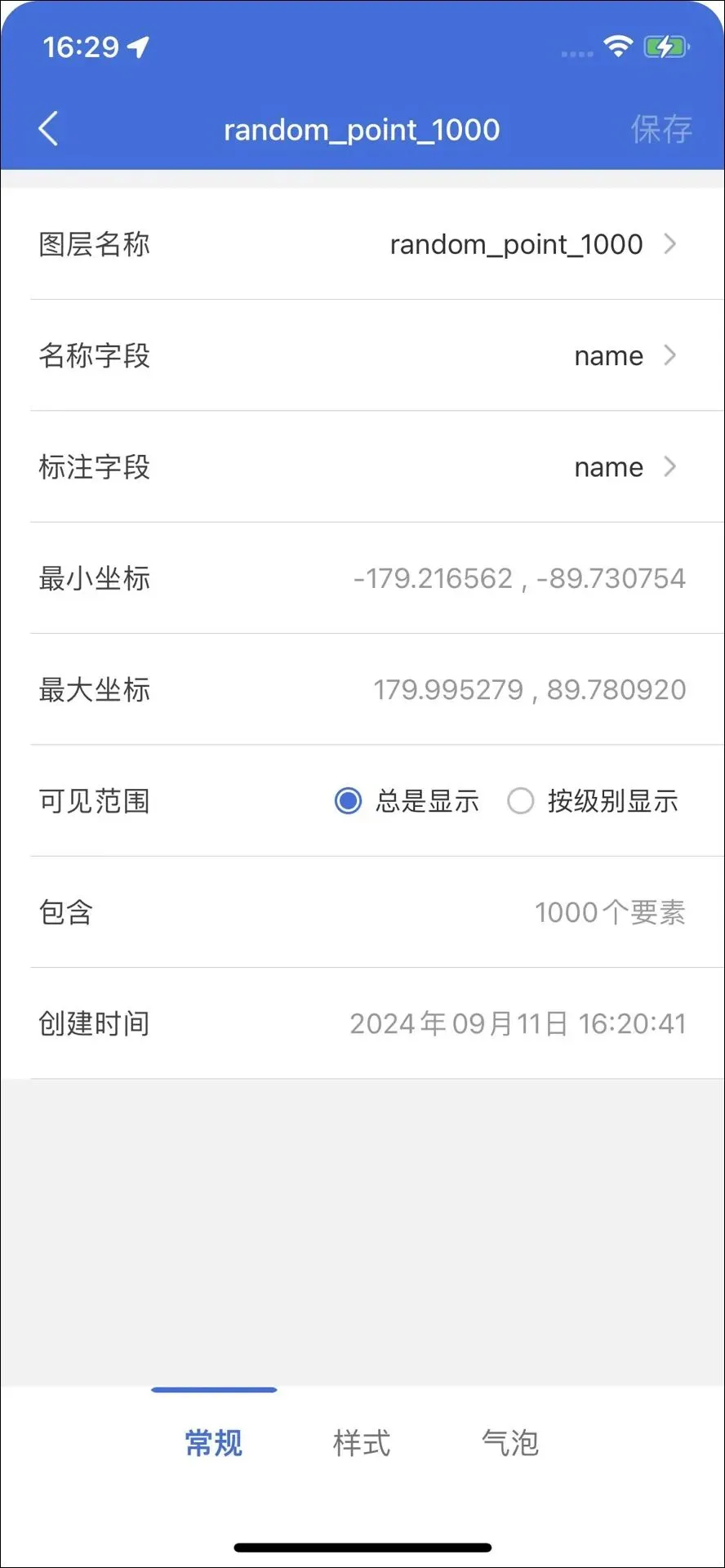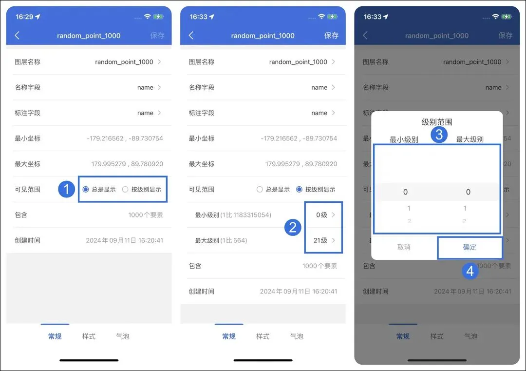 可见范围:是用于设置要素在地图中的显示规则,目前支持【总是显示、按级别显示】两种模式。
