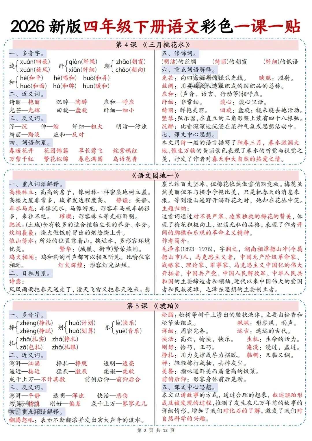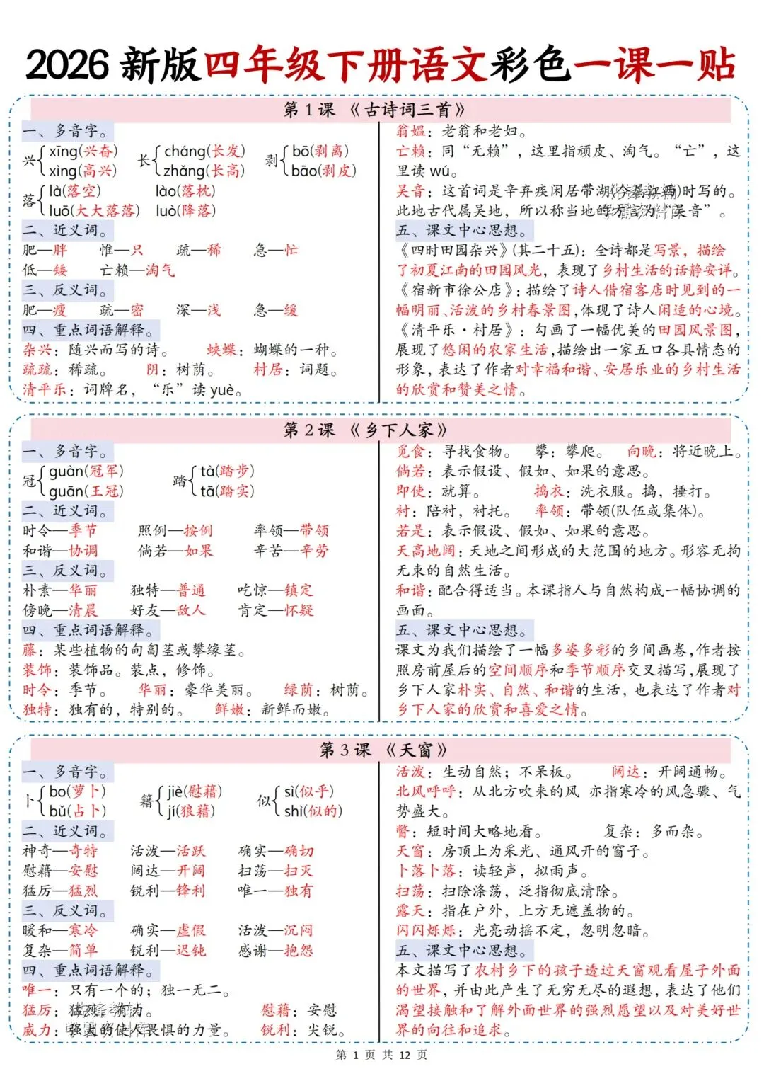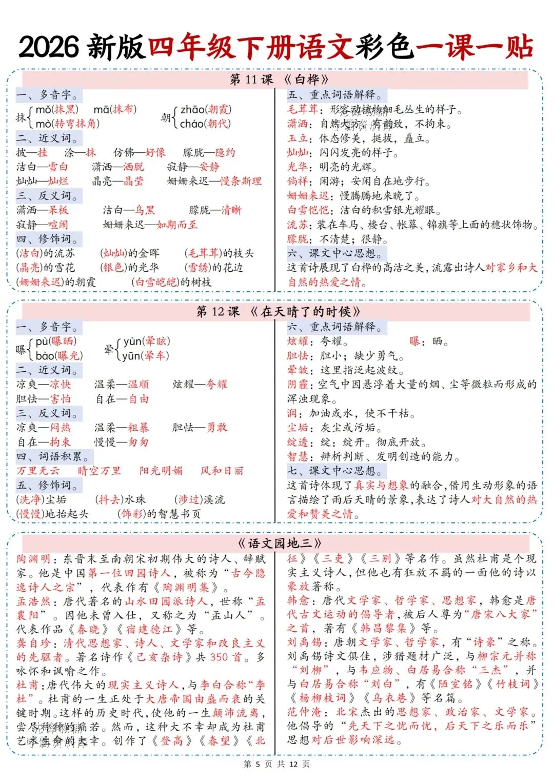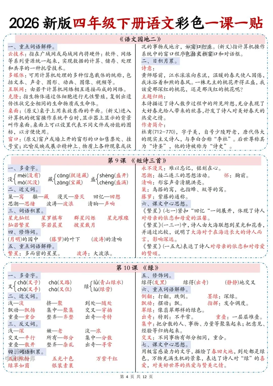 2026春最新版:《四年级语文下册彩色课课贴》电子版可打印